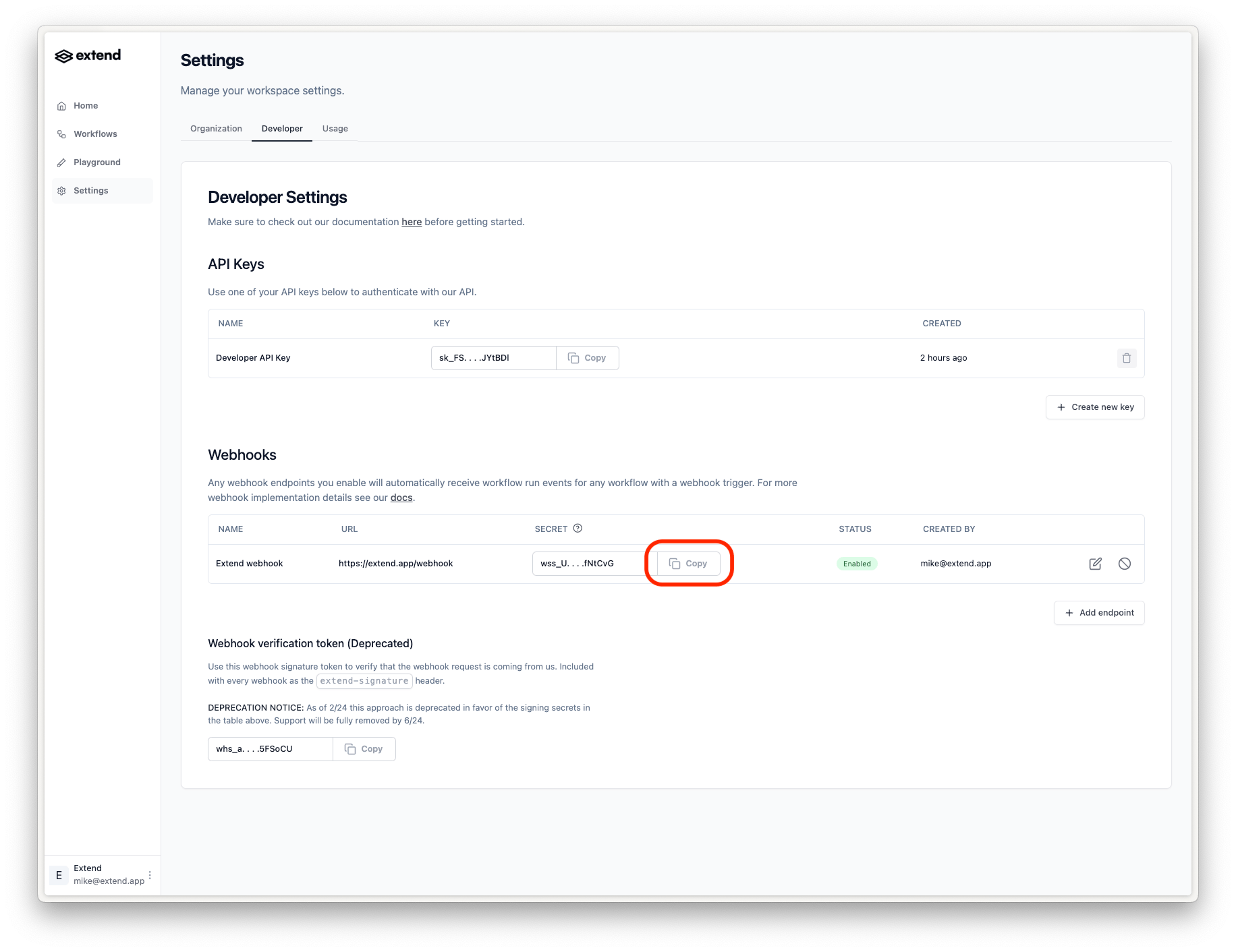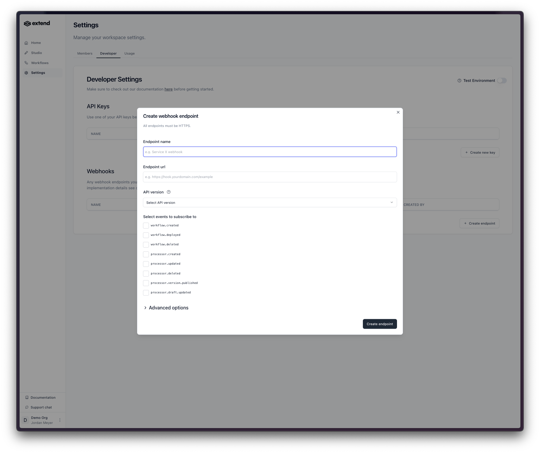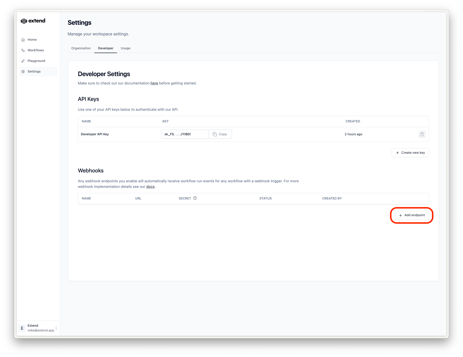 To set up a webhook, you can create one in the Extend dashboard settings under the “Developer” tab