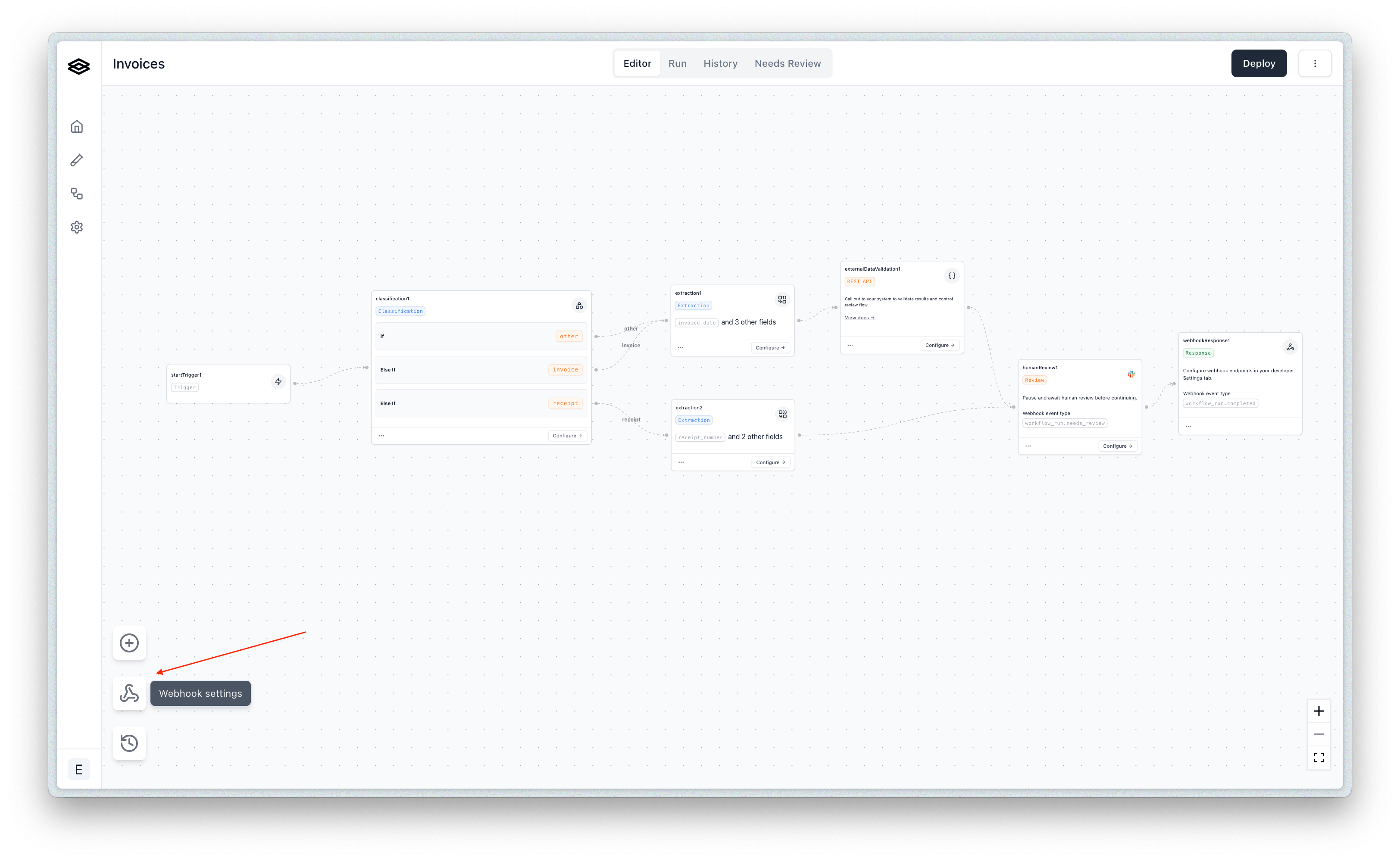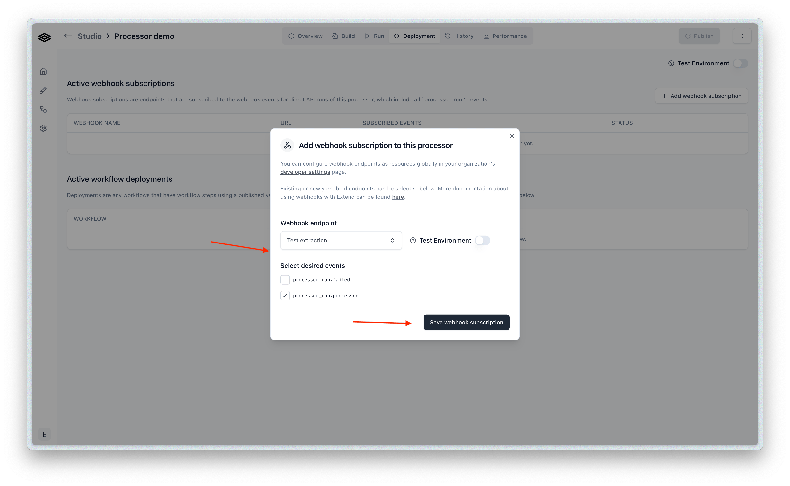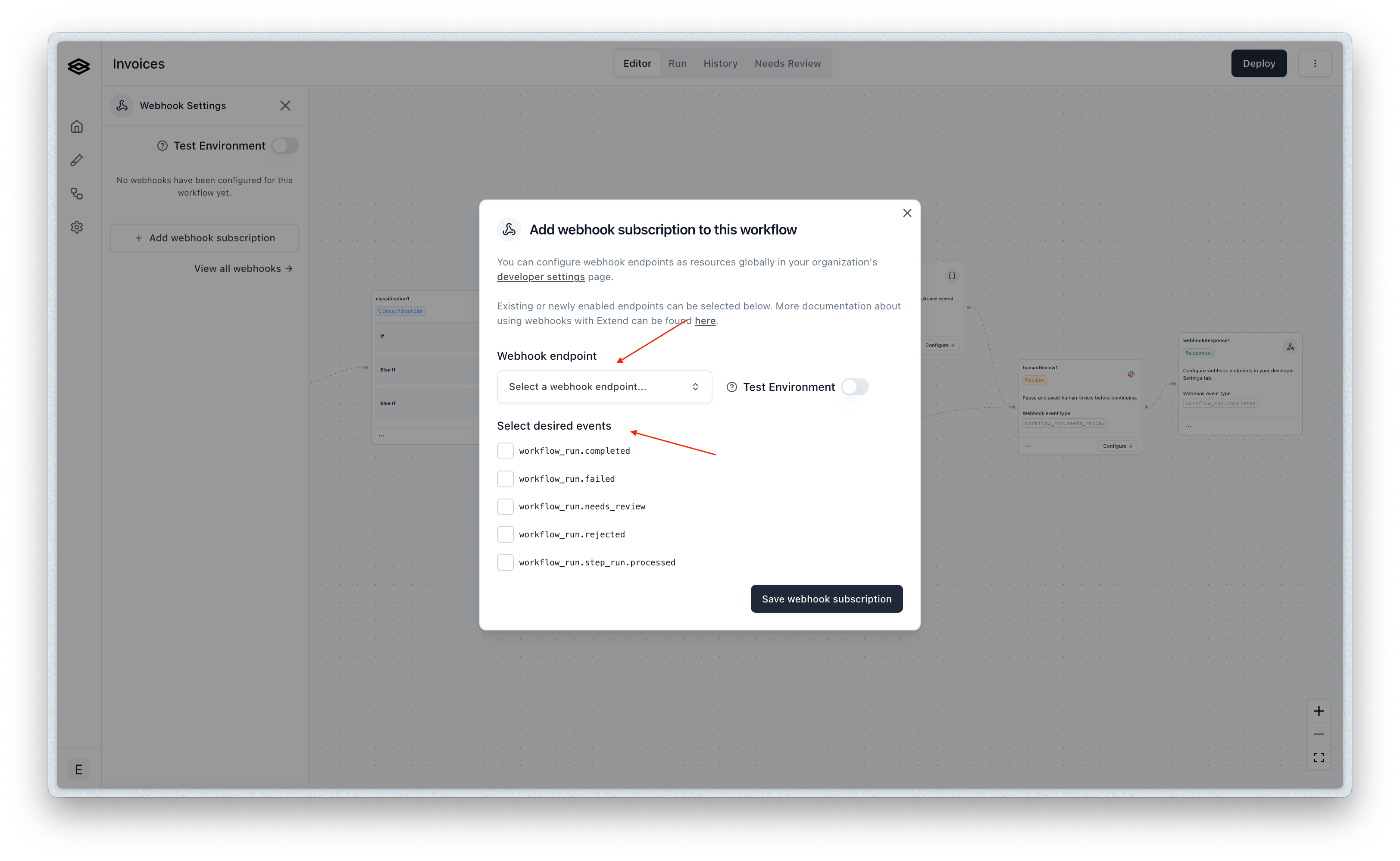 To set up a webhook, you can create one in the Extend dashboard settings under the “Developer” tab