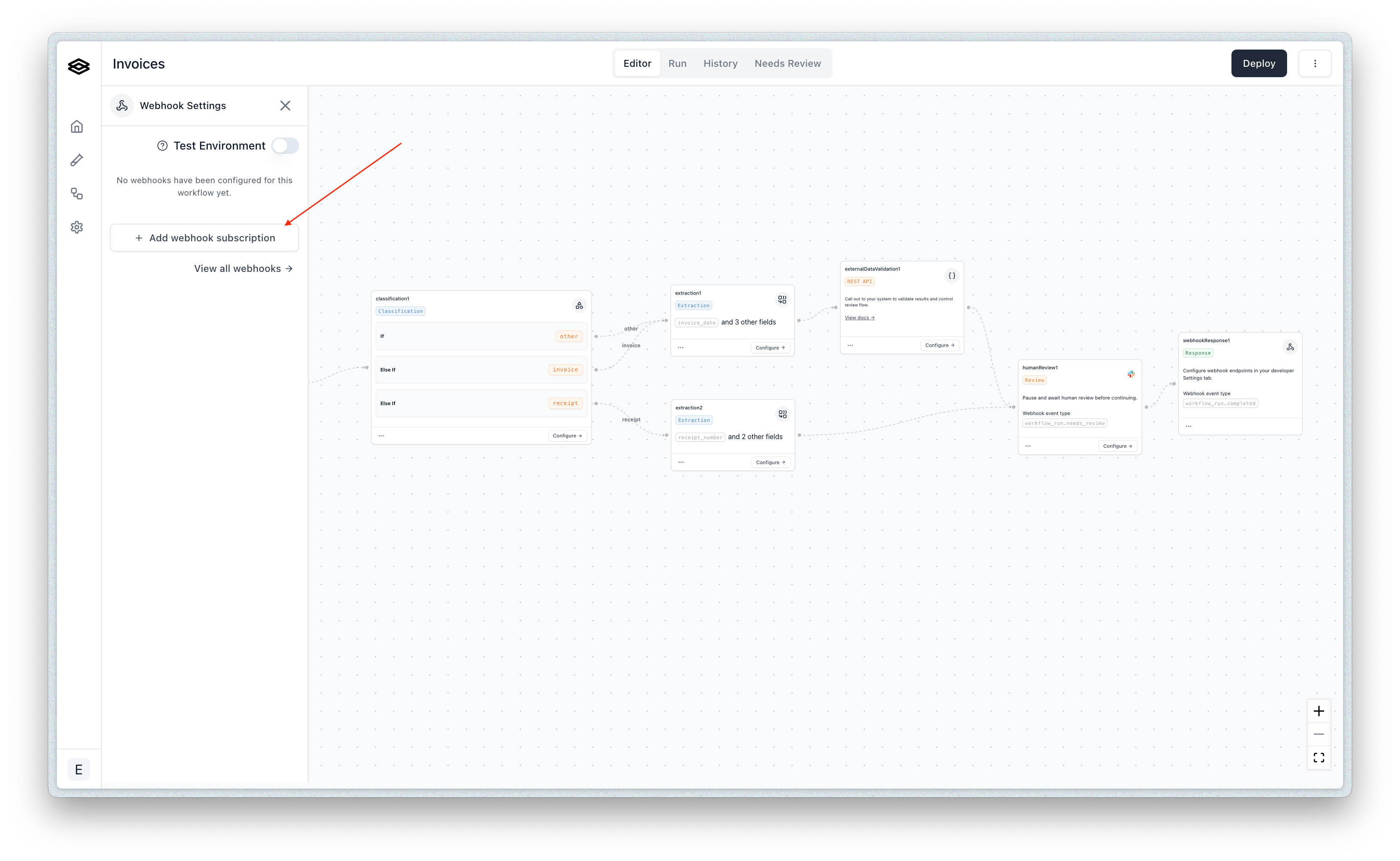 After you have created one or more webhook endpoints from the “Developer” tab, you can subscribe to events for specific workflows by navigating to the desired workflow(s) and opening the “Webhook Subscriptions” menu.