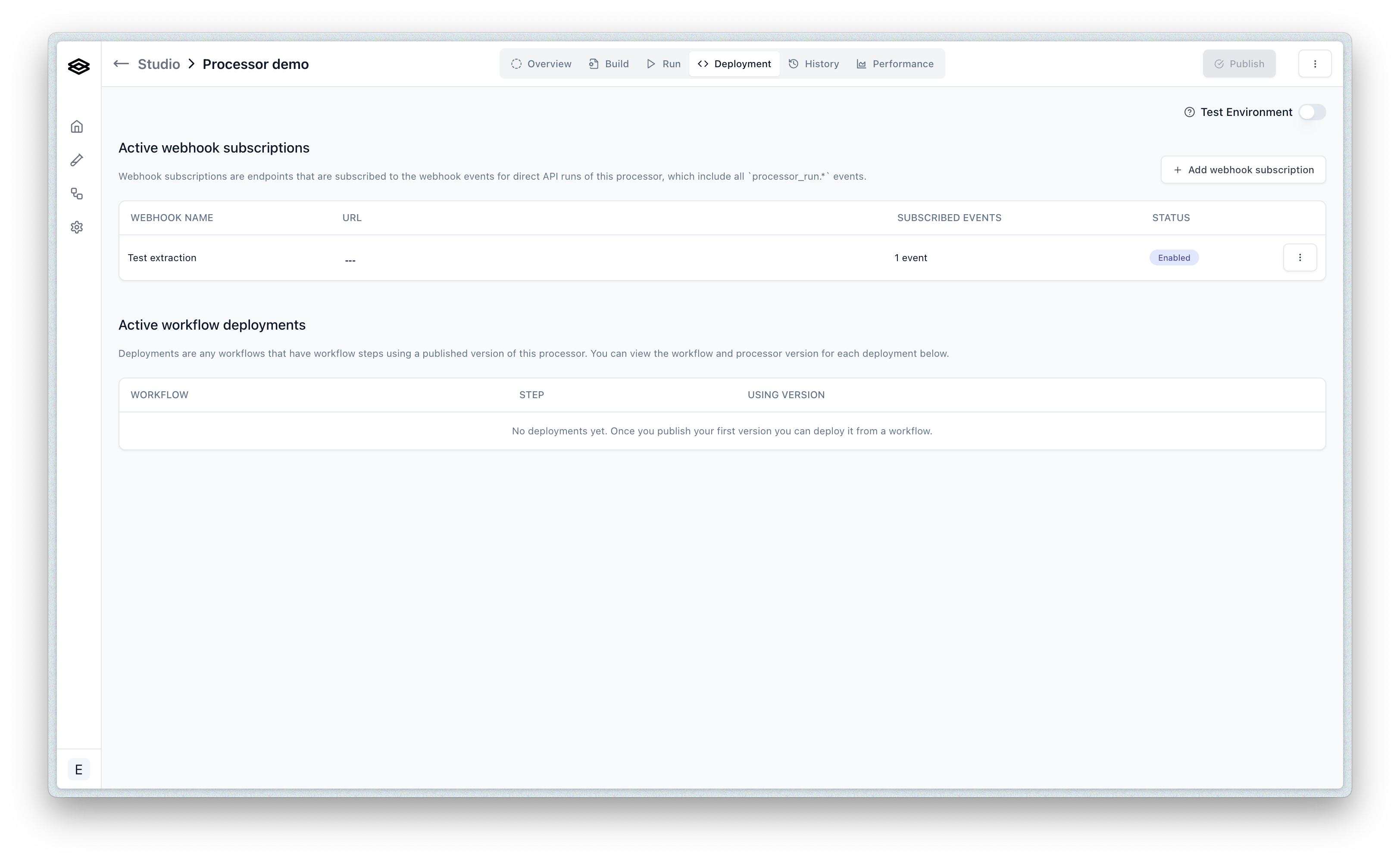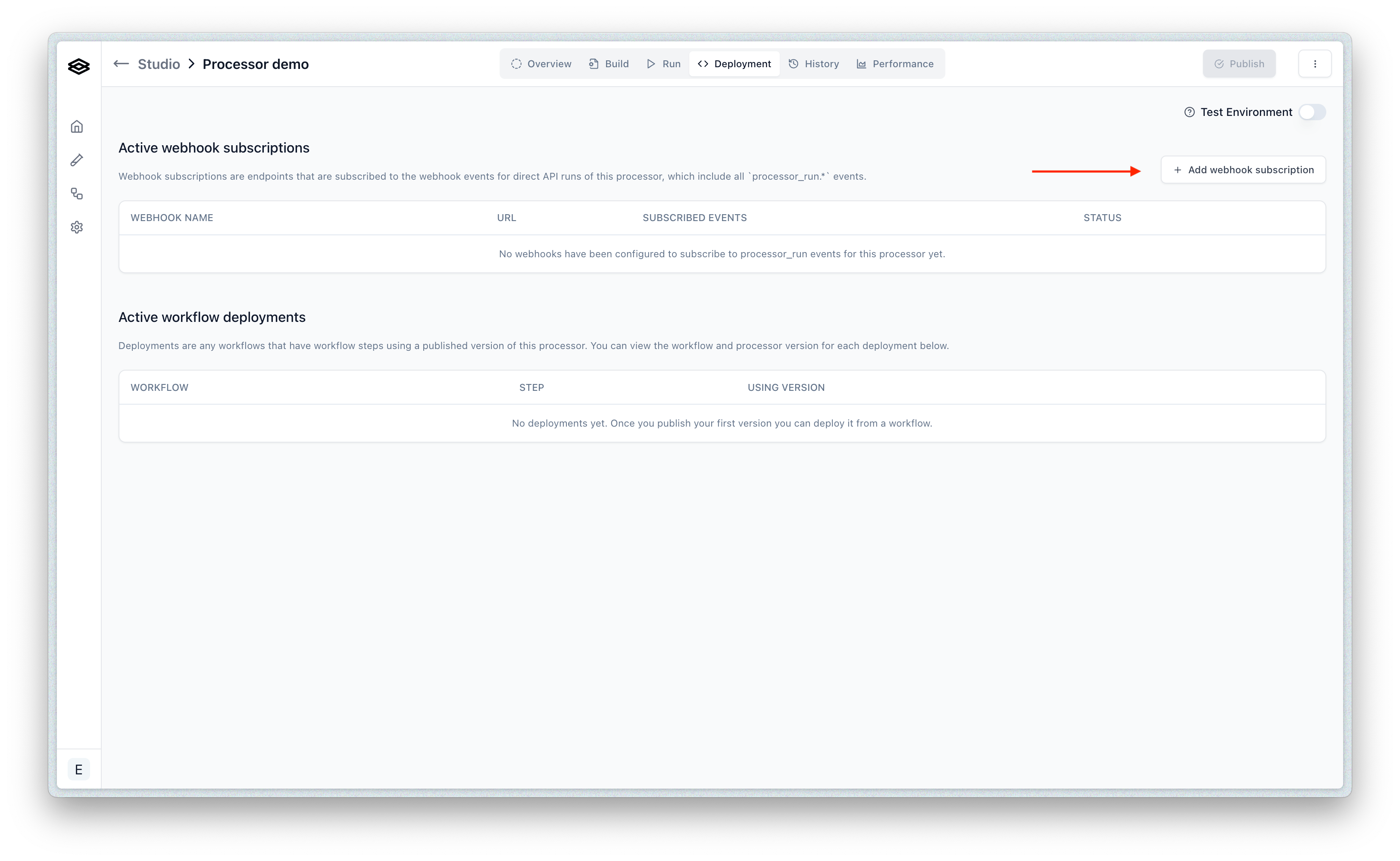 To start, navigate to the Deployment tab of the given processor in Studio and click the “Create Webhook Subscription” button.