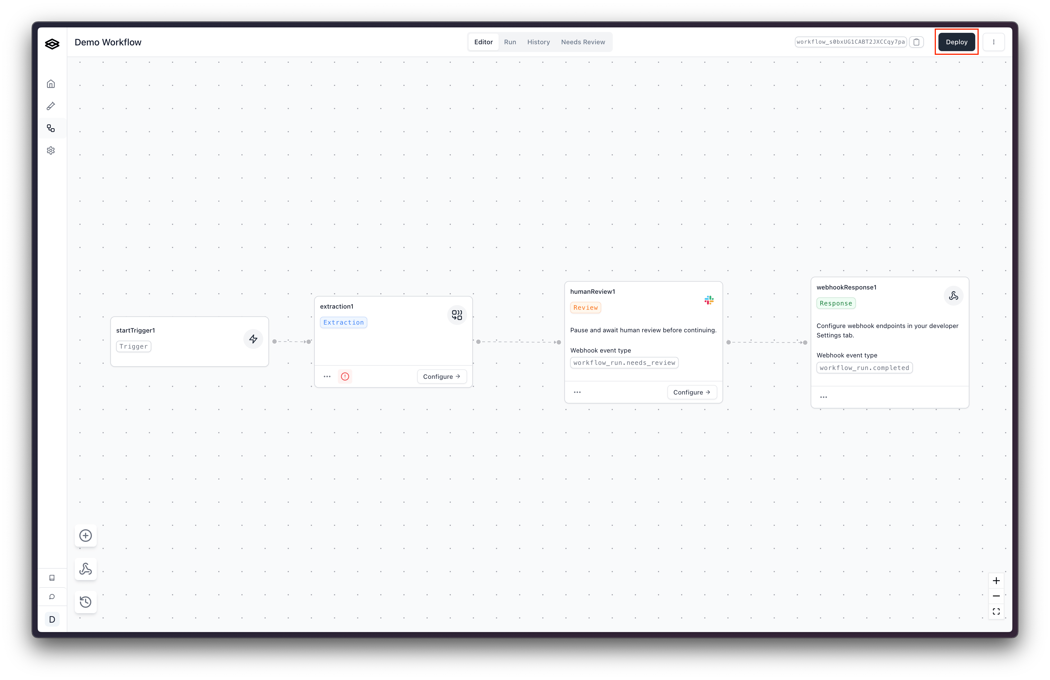 Deploying a workflow typically creates a new, immutable version of it. To do this, click the “Deploy” button in the top right corner of the workflow builder.