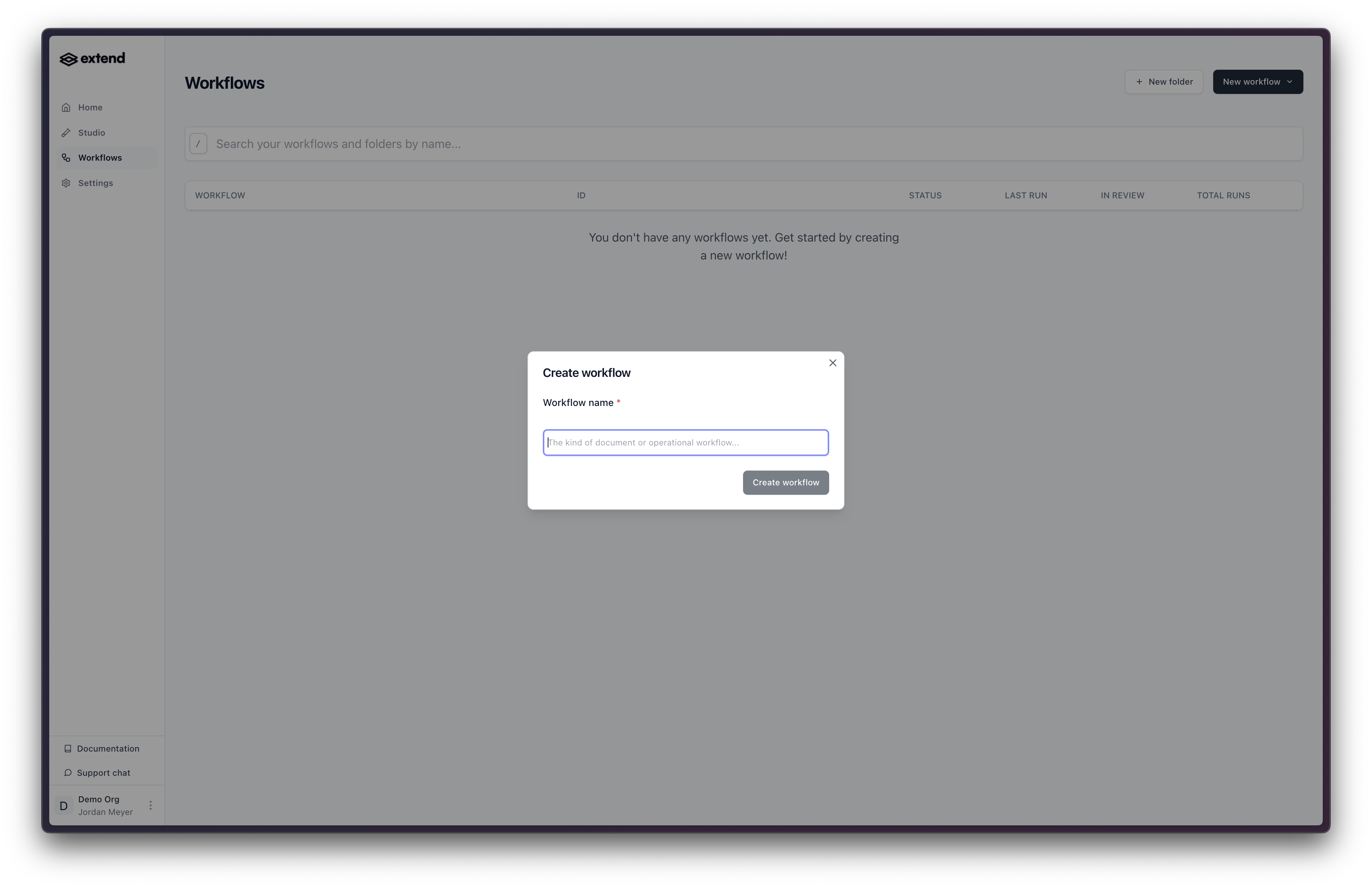 - You will be prompted to give your new Workflow a name. Choose a descriptive name that reflects the process it will handle (e.g., “Invoice Processing Workflow”, “Claim Form Extraction”).