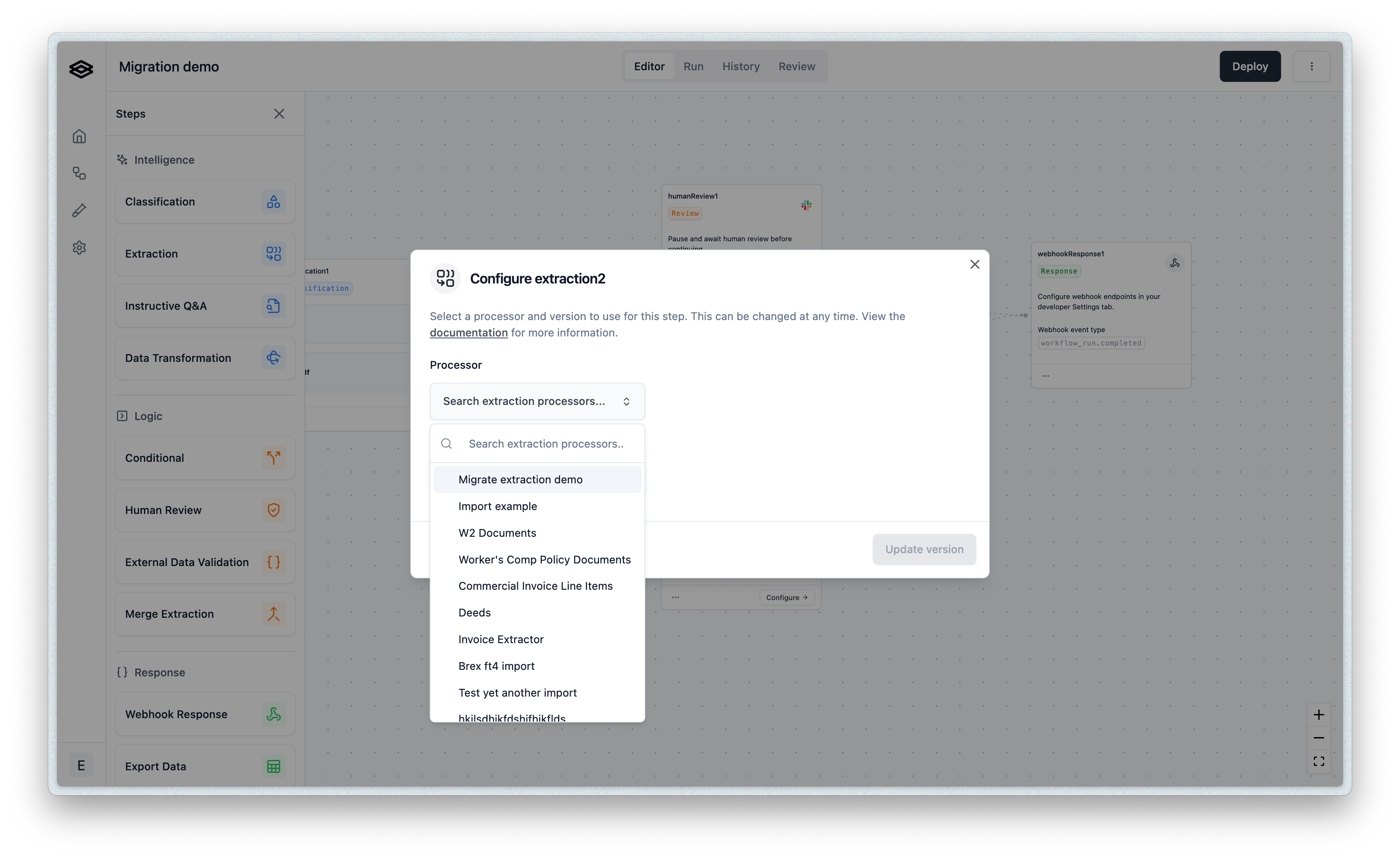 - Step Drawer: A list of available step types you can add (e.g., Extraction, Classification, Splitting, etc.).