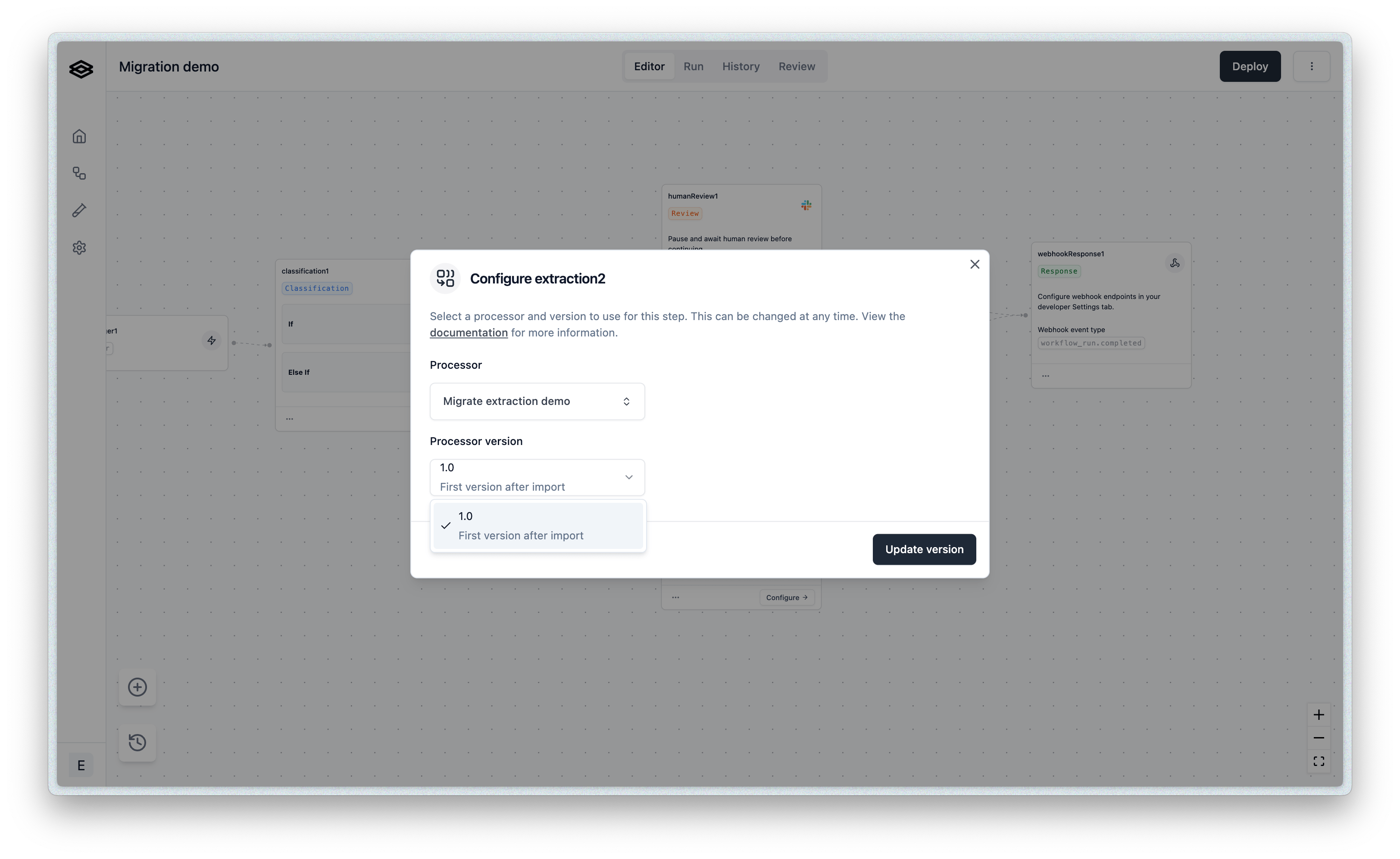 - Version Selection: After selecting the processor, another dropdown will allow you to choose the specific version of that processor you wish to use (e.g., the major or minor version you just published).