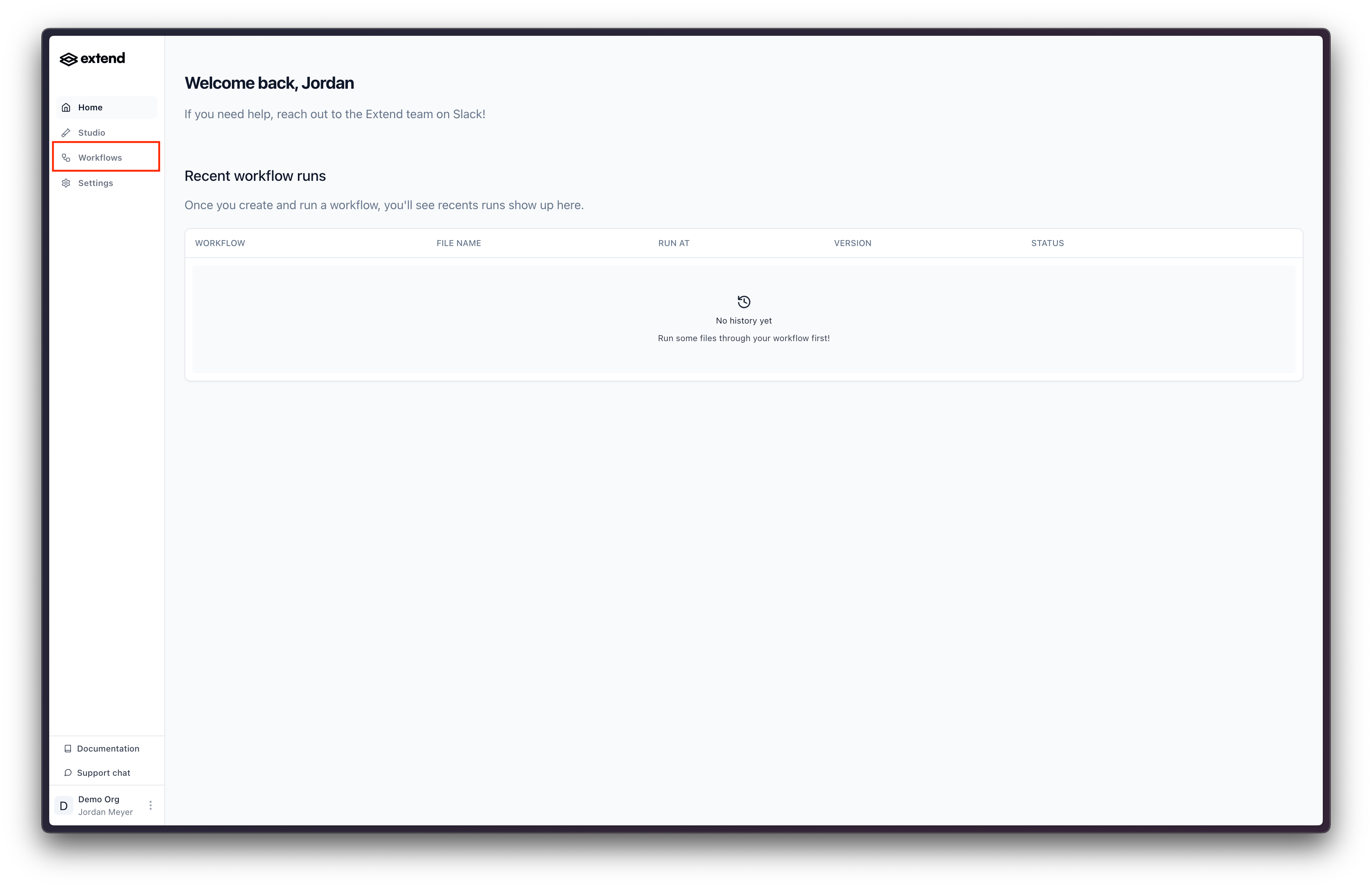 Workflows can be accessed from the main navigation menu in Extend Studio. Look for the “Workflows” section in the left sidebar.