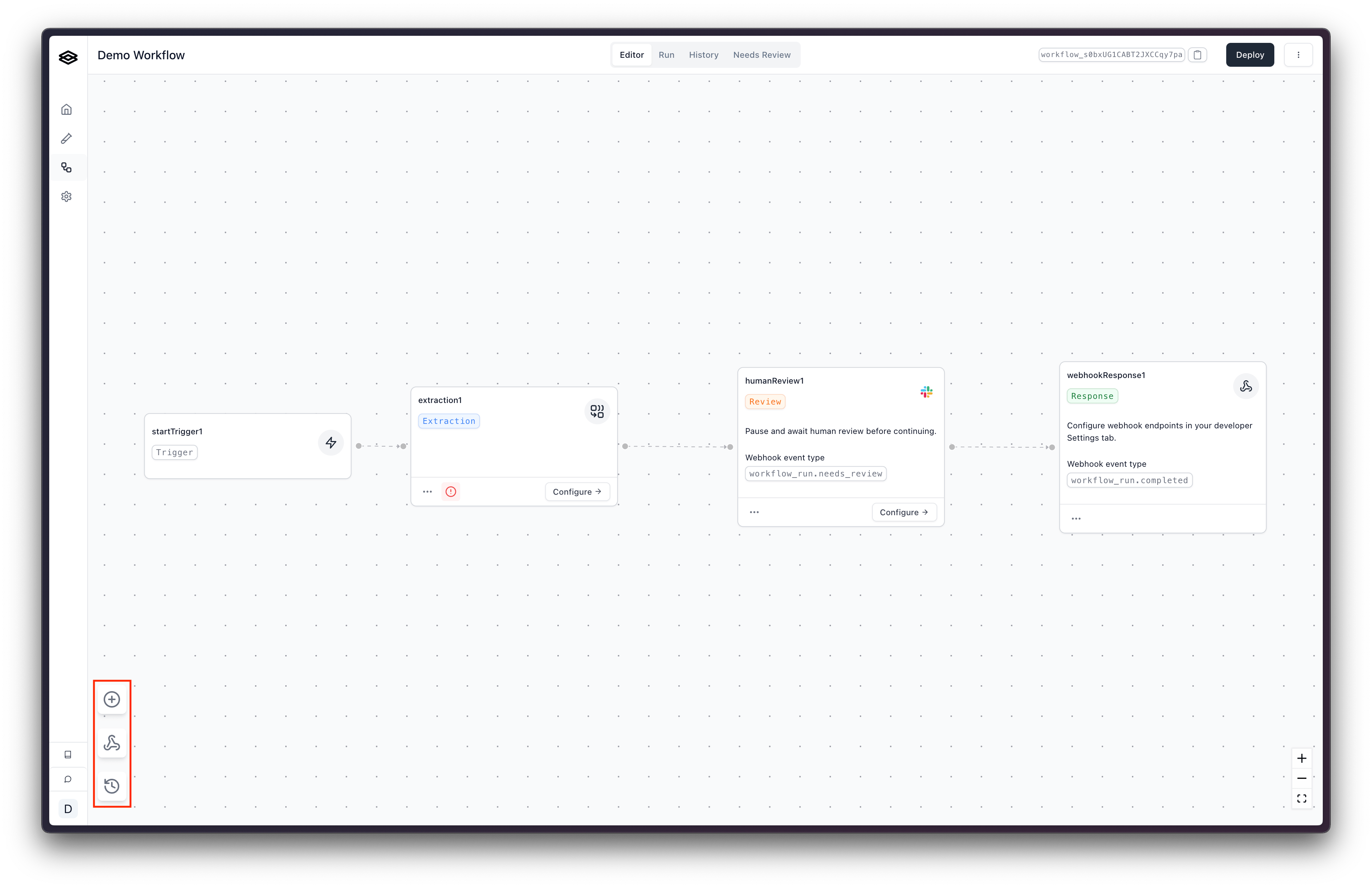 After creation, you’ll be taken to the Workflow Builder. This is a visual canvas where you can add and connect different processing steps. There are buttons in the bottom left corner of the canvas that allow you to add steps, configure webhooks, and manage workflow versions.