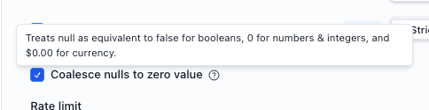 For booleans, null and false will be treated as a match. For numbers, 0 and null will be treated as a match. For currency $0.00 and null will be a match.