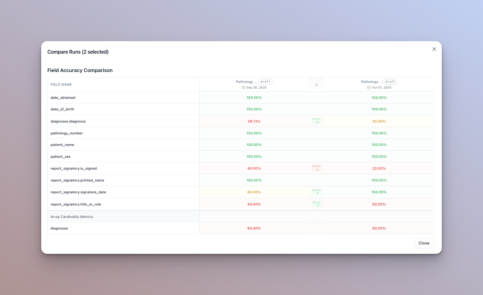 In this dialog, you can see color coded accuracy metrics, and whether they increased or decreased between runs. Hover over a column to see the exact change in percentage.