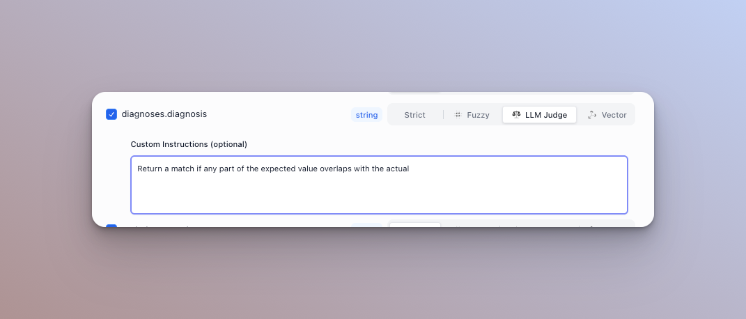For string type fields, you can configure a custom matcher. There are four available to toggle from: strict, fuzzy, LLM judge, and vector.