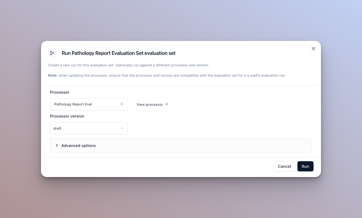 - Click the “Run” button on the evaluation set you want to run. This will open the run dialog.