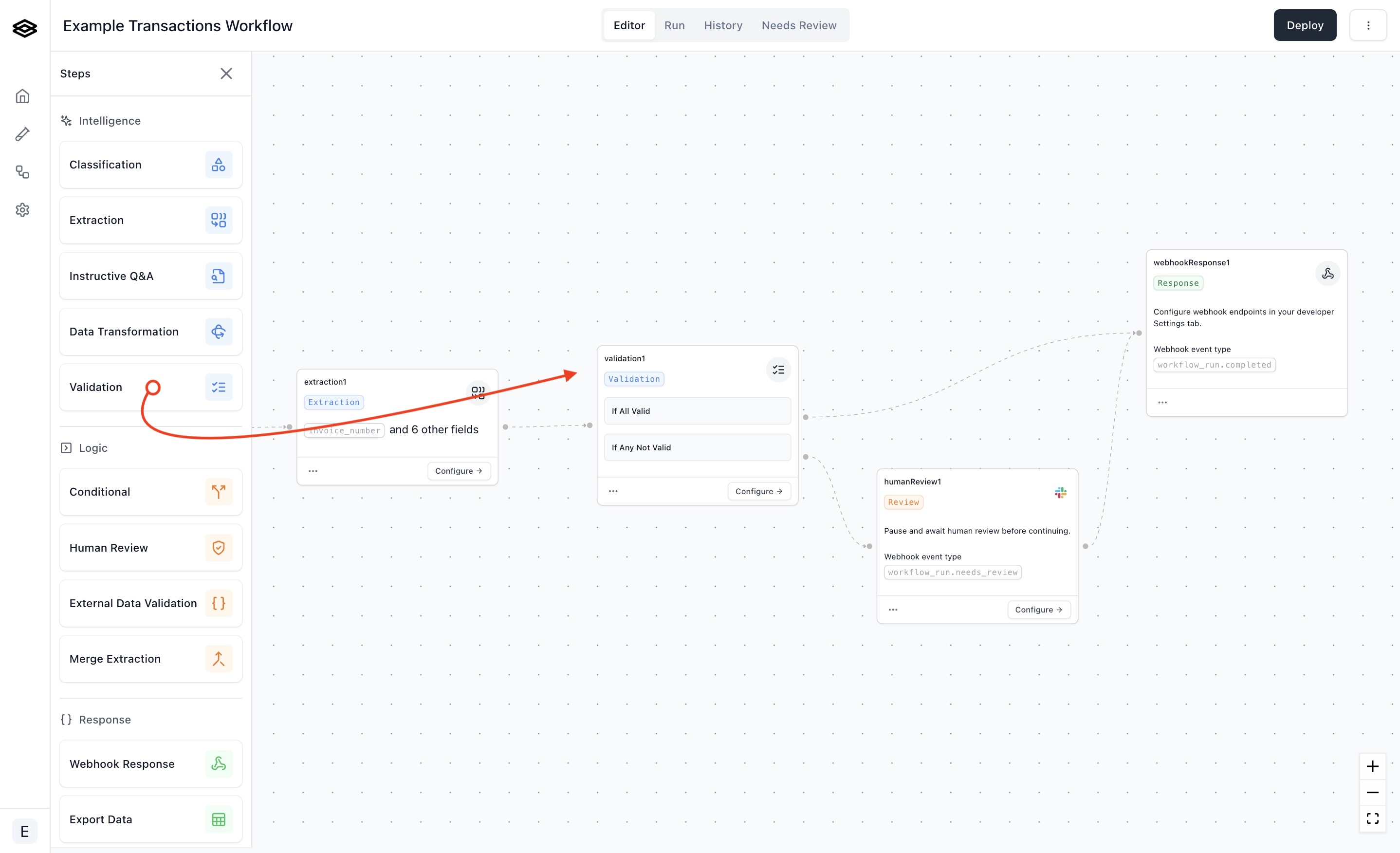 A Validation step also has two output steps, one if all the rules pass and one otherwise. Only one of the two output steps will be executed for any single workflow run. An example workflow topology is to connect the Webhook Response step if all rules pass and a Human Review step if not.