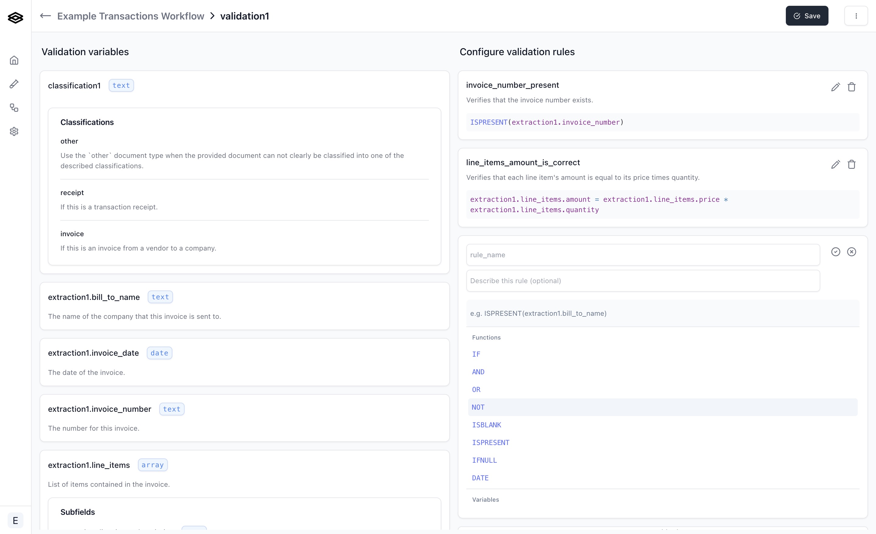 Rules are defined using formulas that transform and calculate data similar to most spreadsheet applications you are familiar with. Formulas can reference classification, extraction, and instruct QA step outputs, as well as data fetched from your systems using an External Data Validation step.