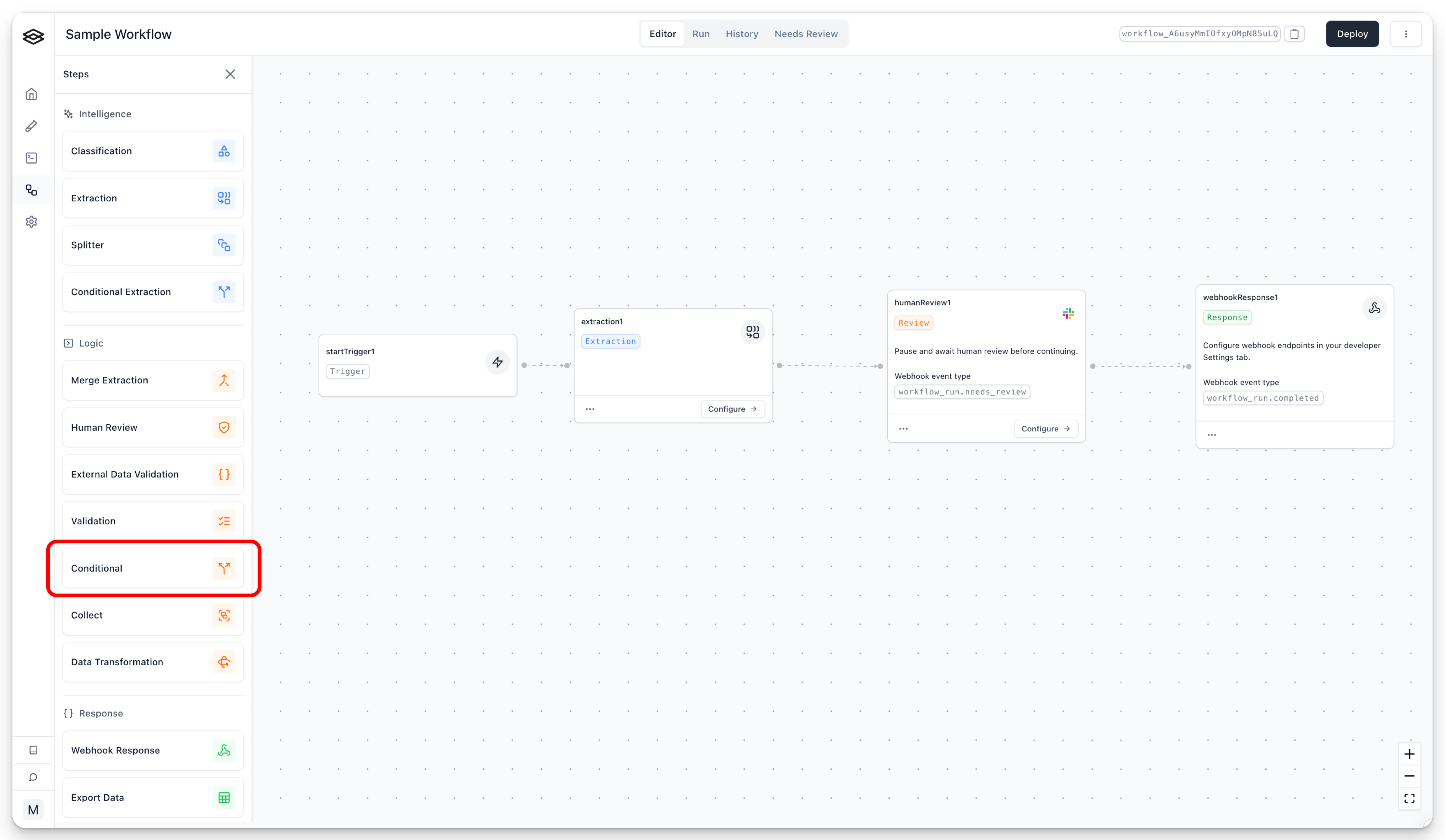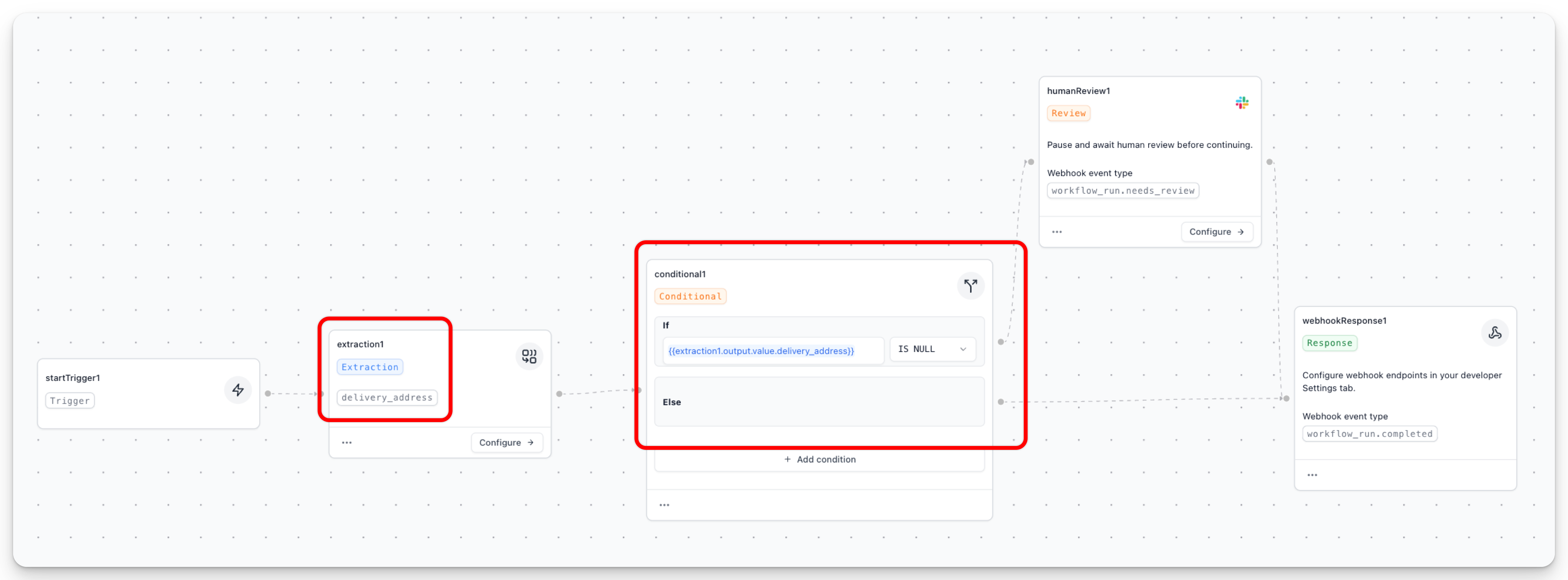 Once you drag the step into your workflow, you can configure it in the UI. Here, we set up the conditional step to lead to a human review if a delivery_address we extracted is null. Note that you can add multiple conditions with the “Add condition” button at the bottom of the conditional step UI, allowing you to make more complex logic.