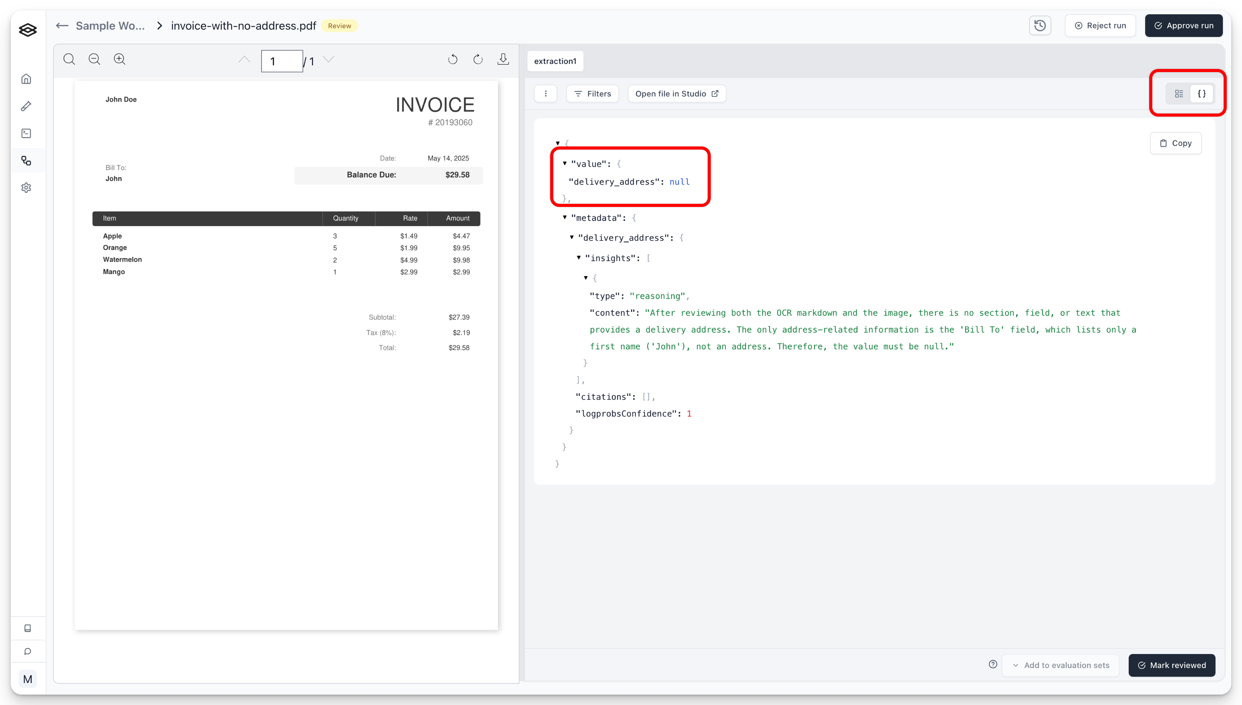 In the below image, we’ve run a document missing a delivery address, through a workflow. Viewing the workflow run with the JSON view toggle in the top right shows us the full structure of the output. Here, we can see .value.delivery_address shows us we extracted null for that field. We can also see the workflow is in “review” since it was routed to conditional review based on our logic.