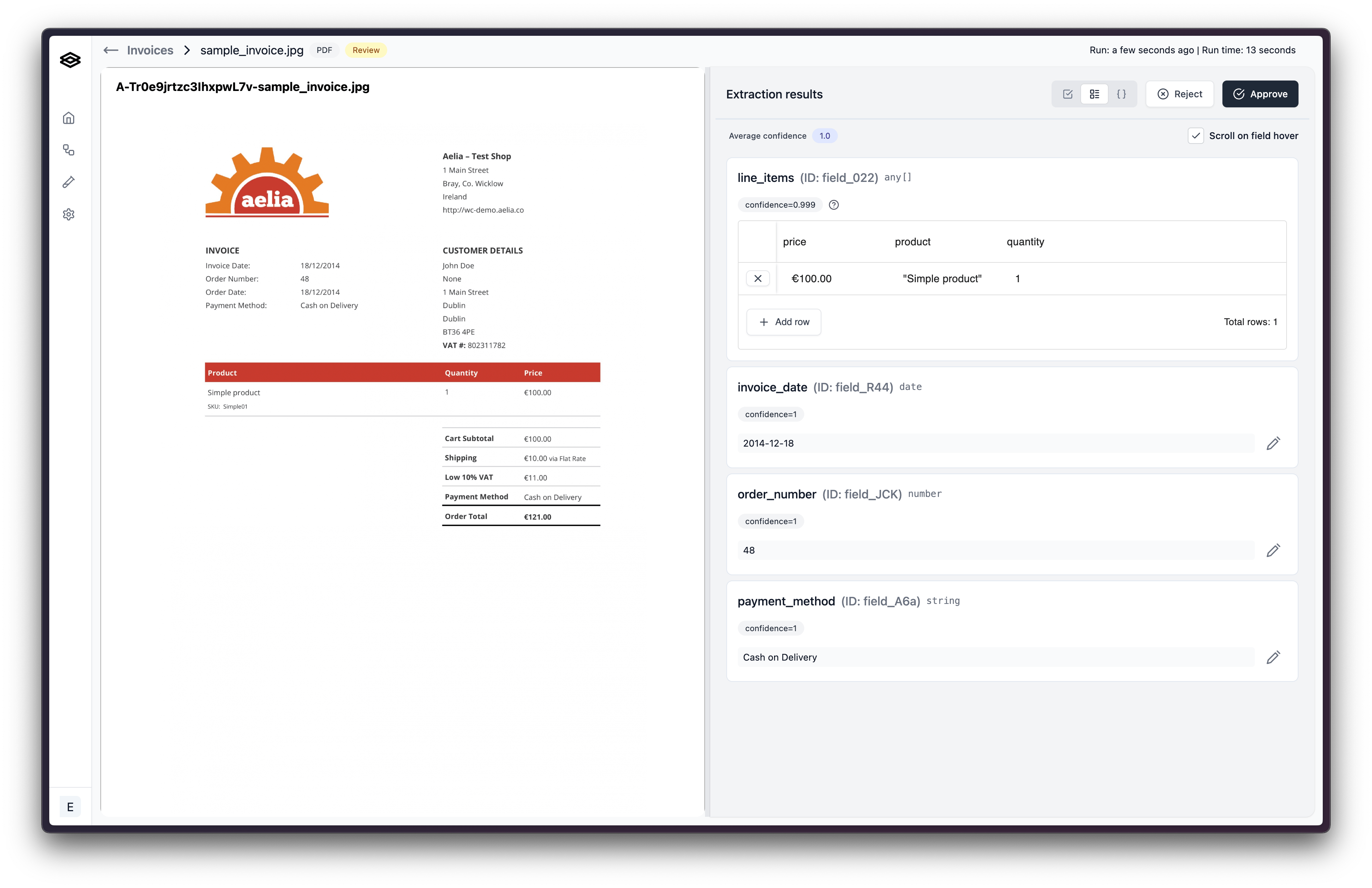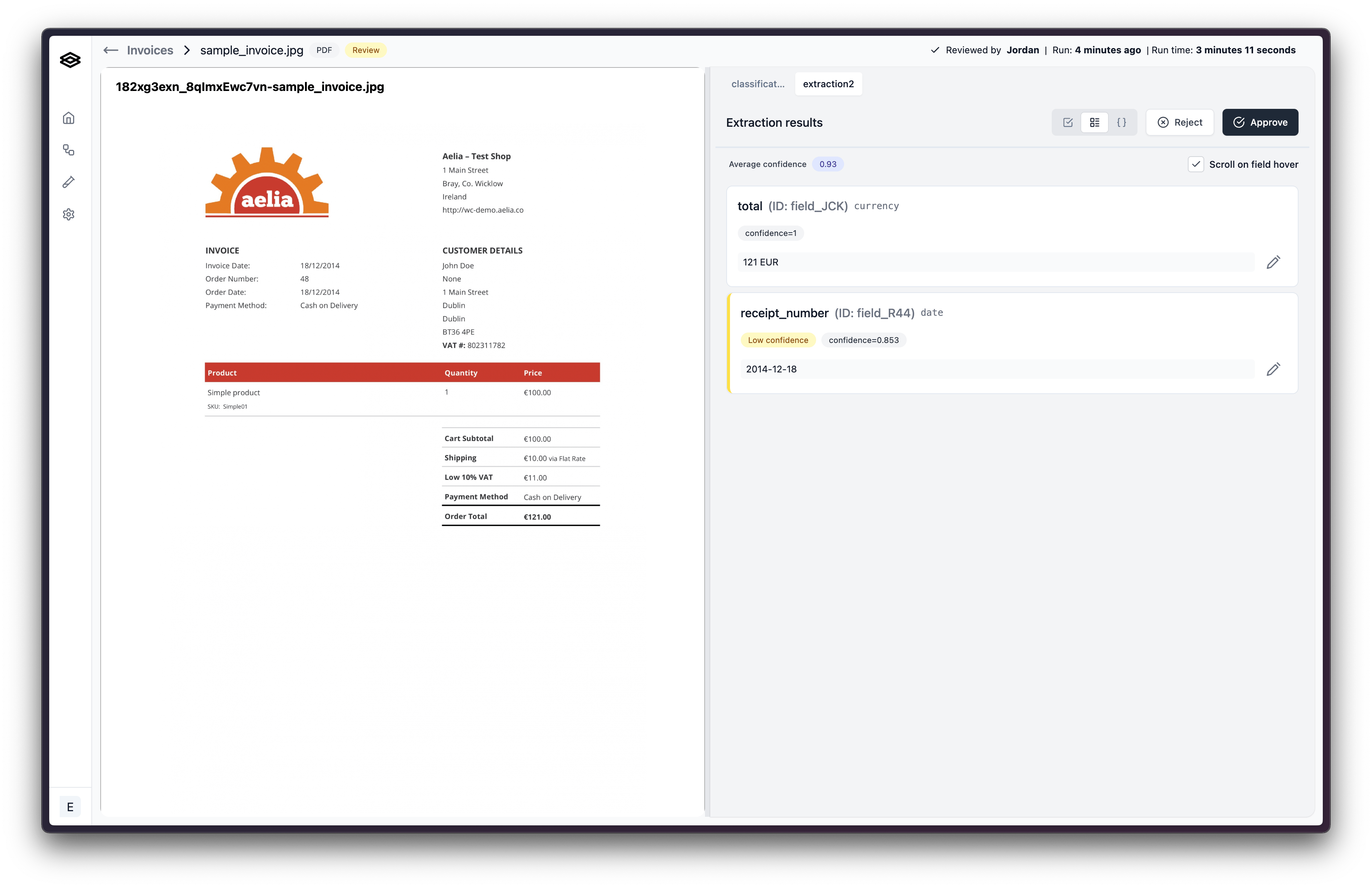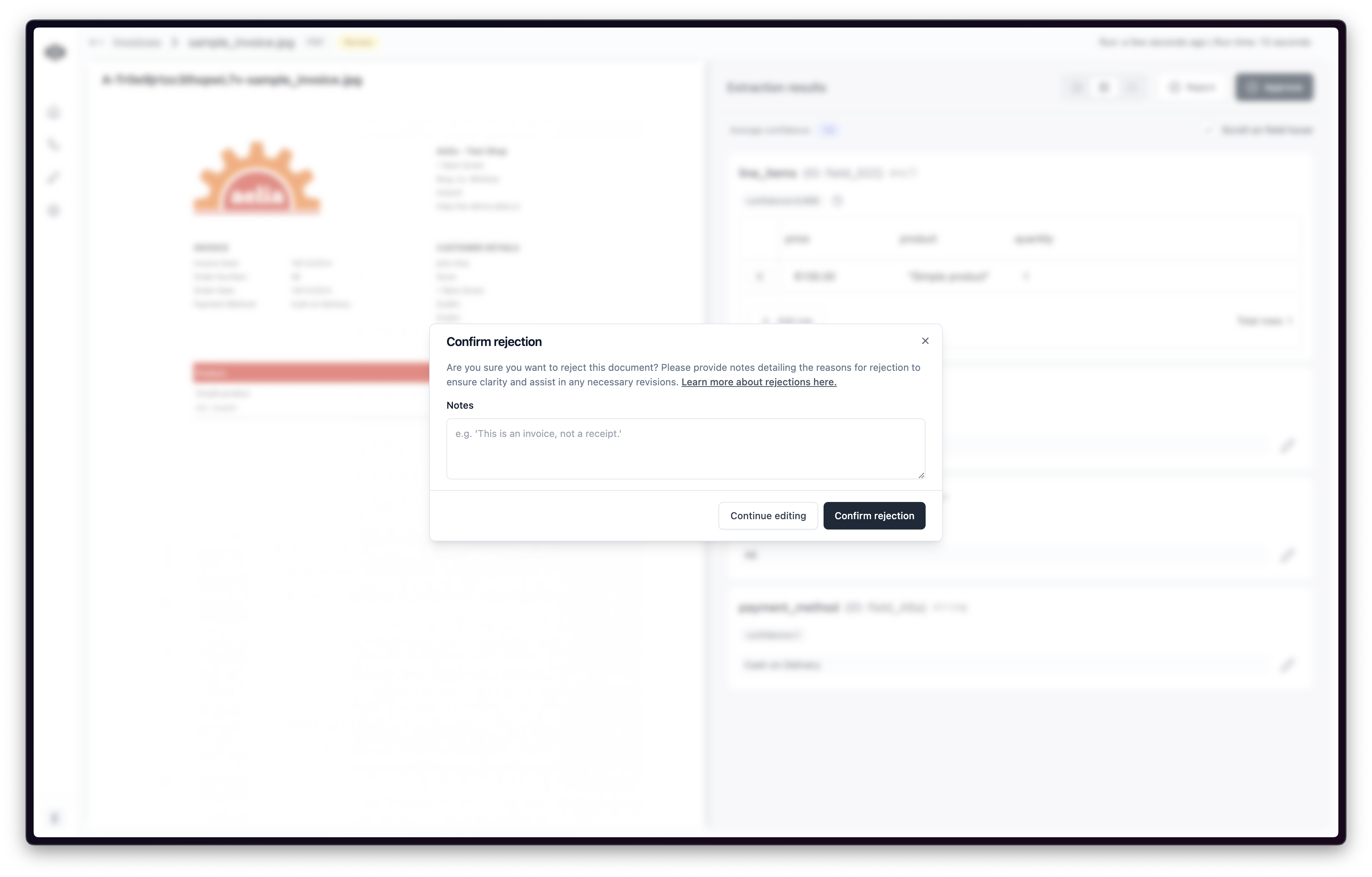 If you find that the document is not valid and should not be processed further, you can reject the workflow run. To do this, click the “Reject” button in the top right corner of the review page.