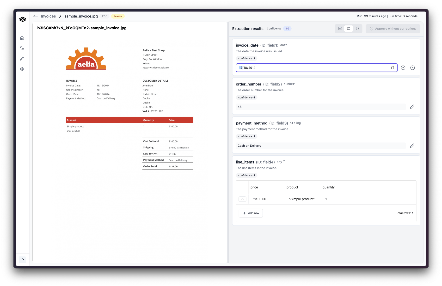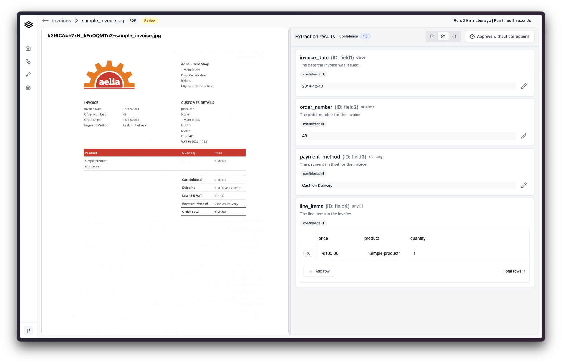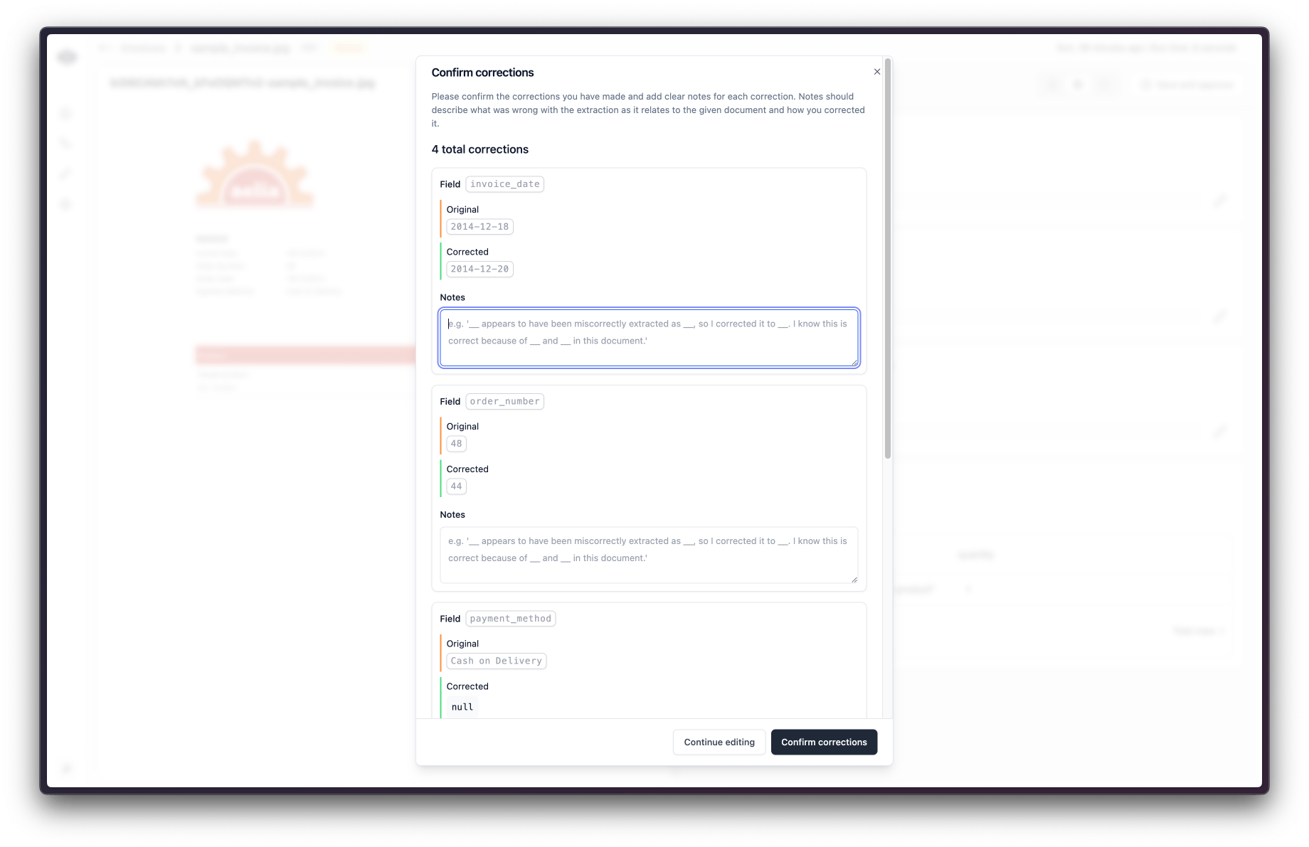 These explanations are used to improve the extraction accuracy so it is important that you clearly and concisely explain what was wrong, what is right, and how you know. Once finished, click “Confirm corrections” and you are done! The workflow run will be updated with the new values.