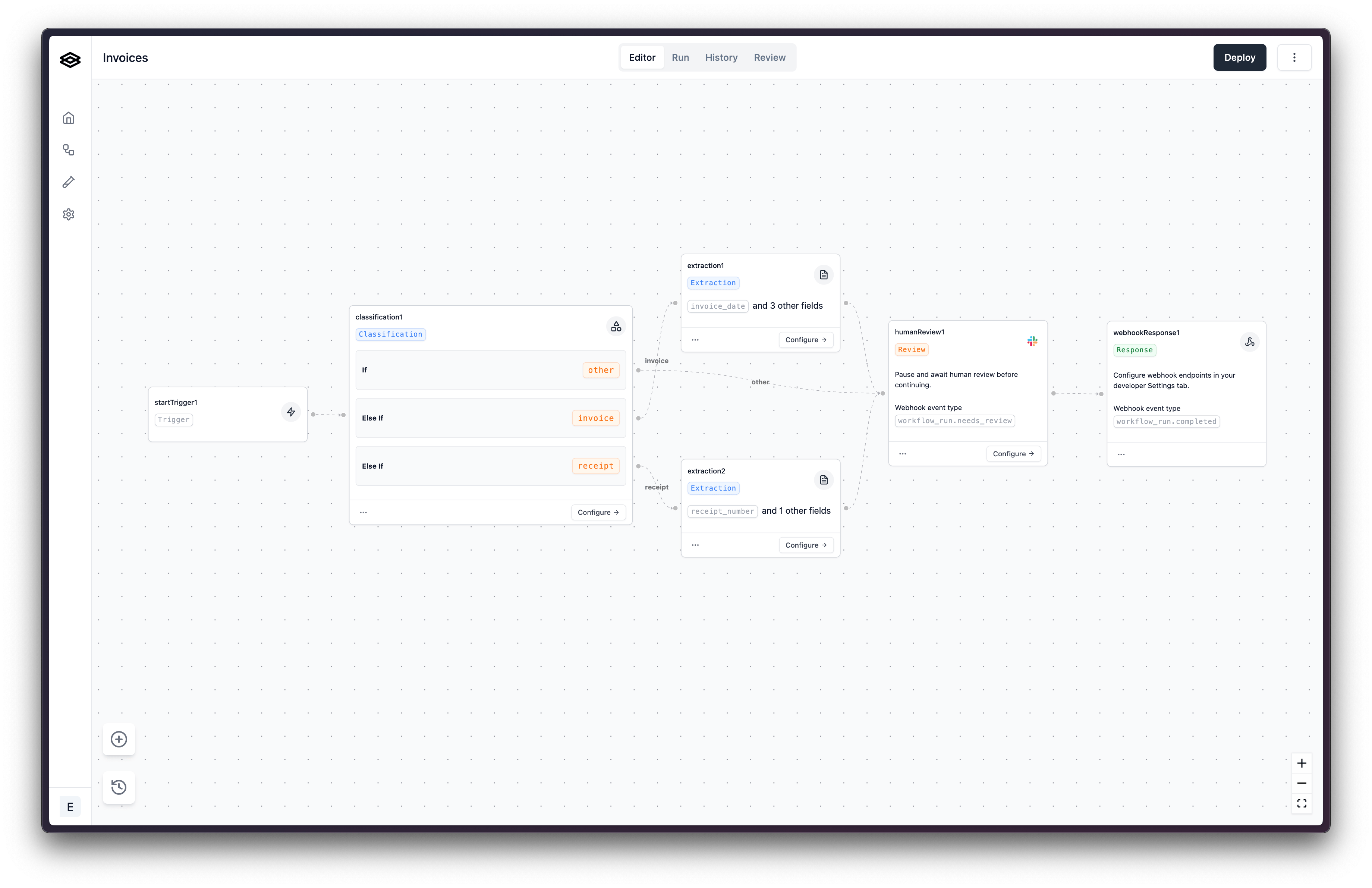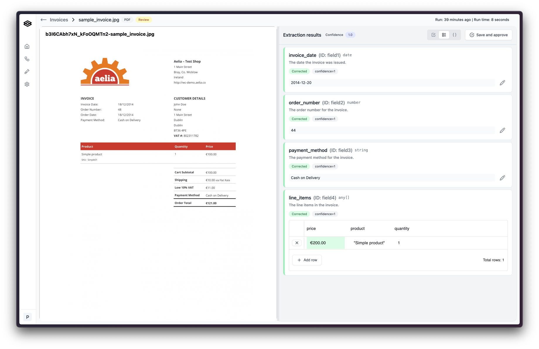 After clicking on a workflow run in need of review, you will see the document on the left and the extraction results displayed on the right.