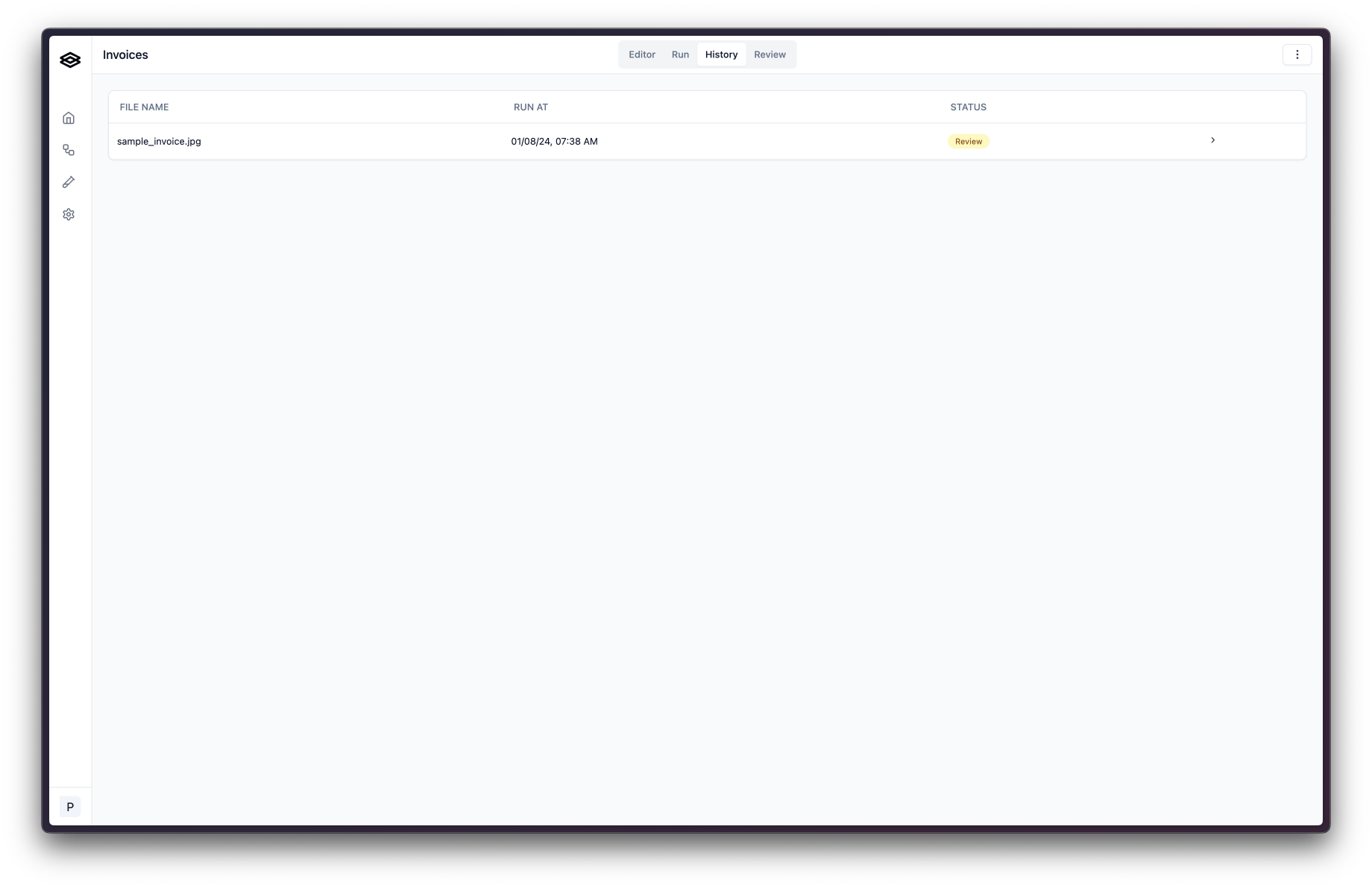 Navigate to the “History” tab of a workflow to see a list of all workflow runs that have been sent to review.