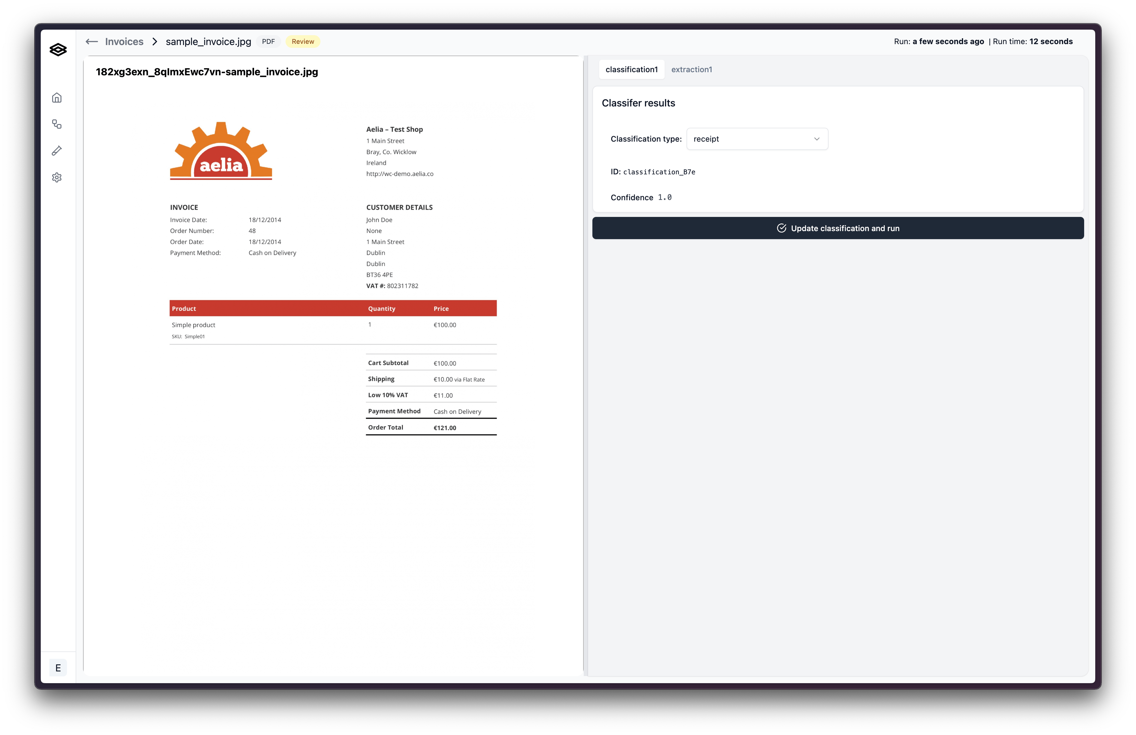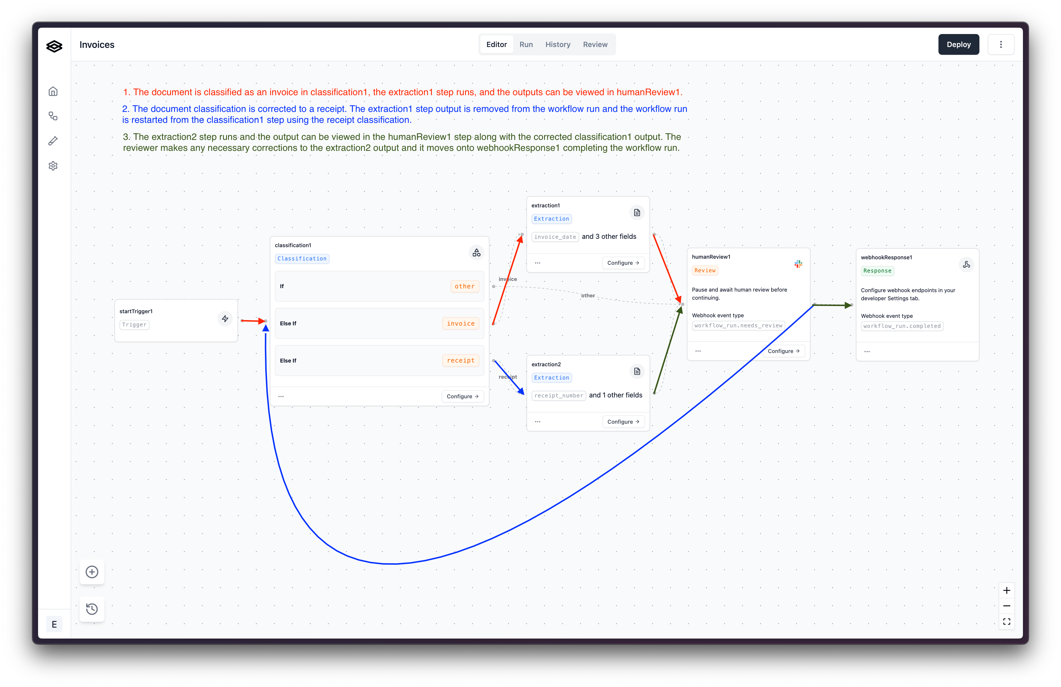 After re-classifying the document as a receipt, the workflow run will be restarted at the classification1 step and the previous extraction step run extraction1 stemming from the incorrect classification will be removed from the workflow run. The document will then be processed by the extraction2 step and go into humanReview1 step again where the updated classification and output from extraction2 step can be viewed.
