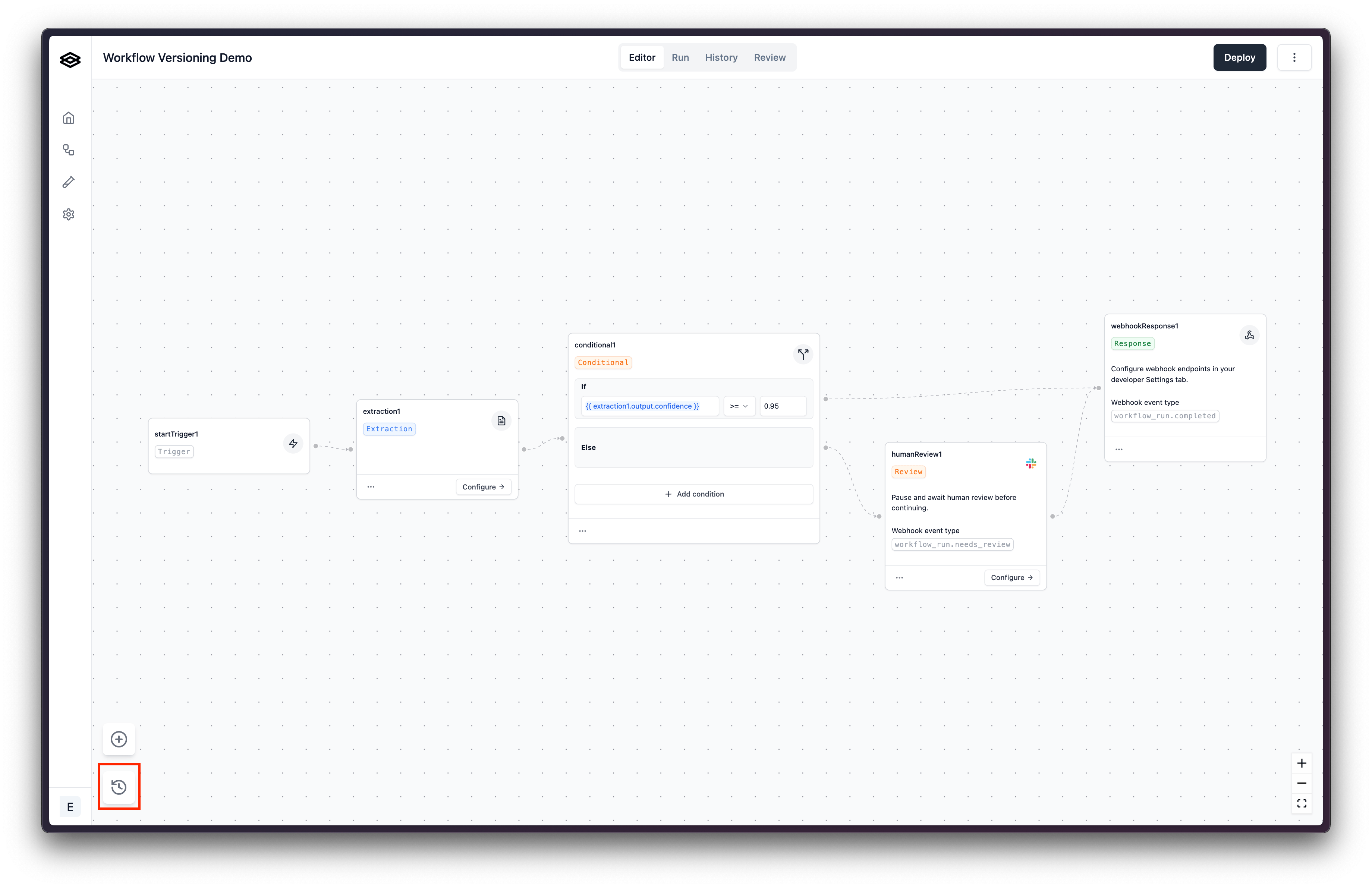 To deploy a new version of the workflow, click on the “Deploy” button in the upper right corner of the workflow editor. This will deploy the current draft version of the workflow and create a new version in the version history.