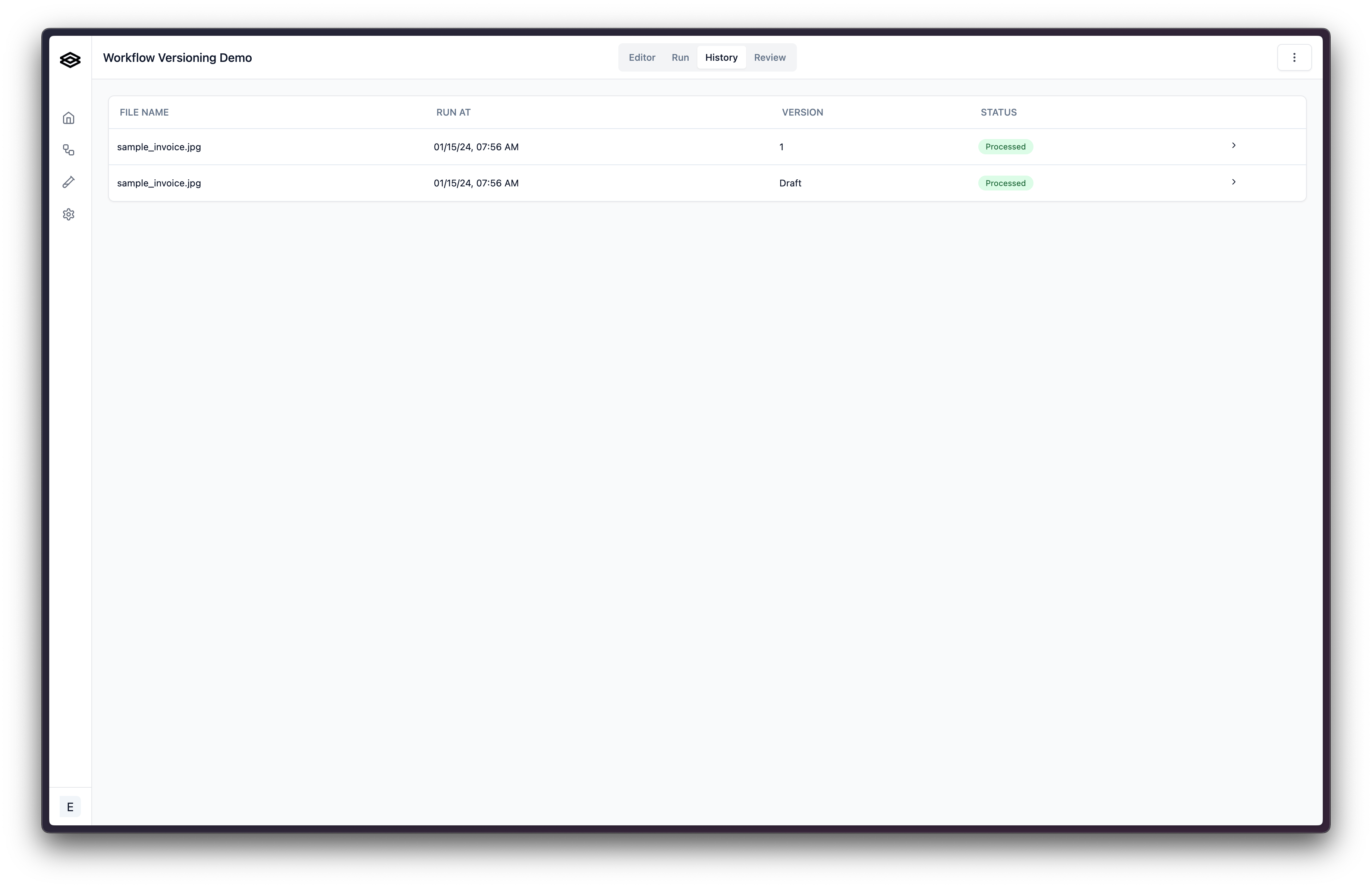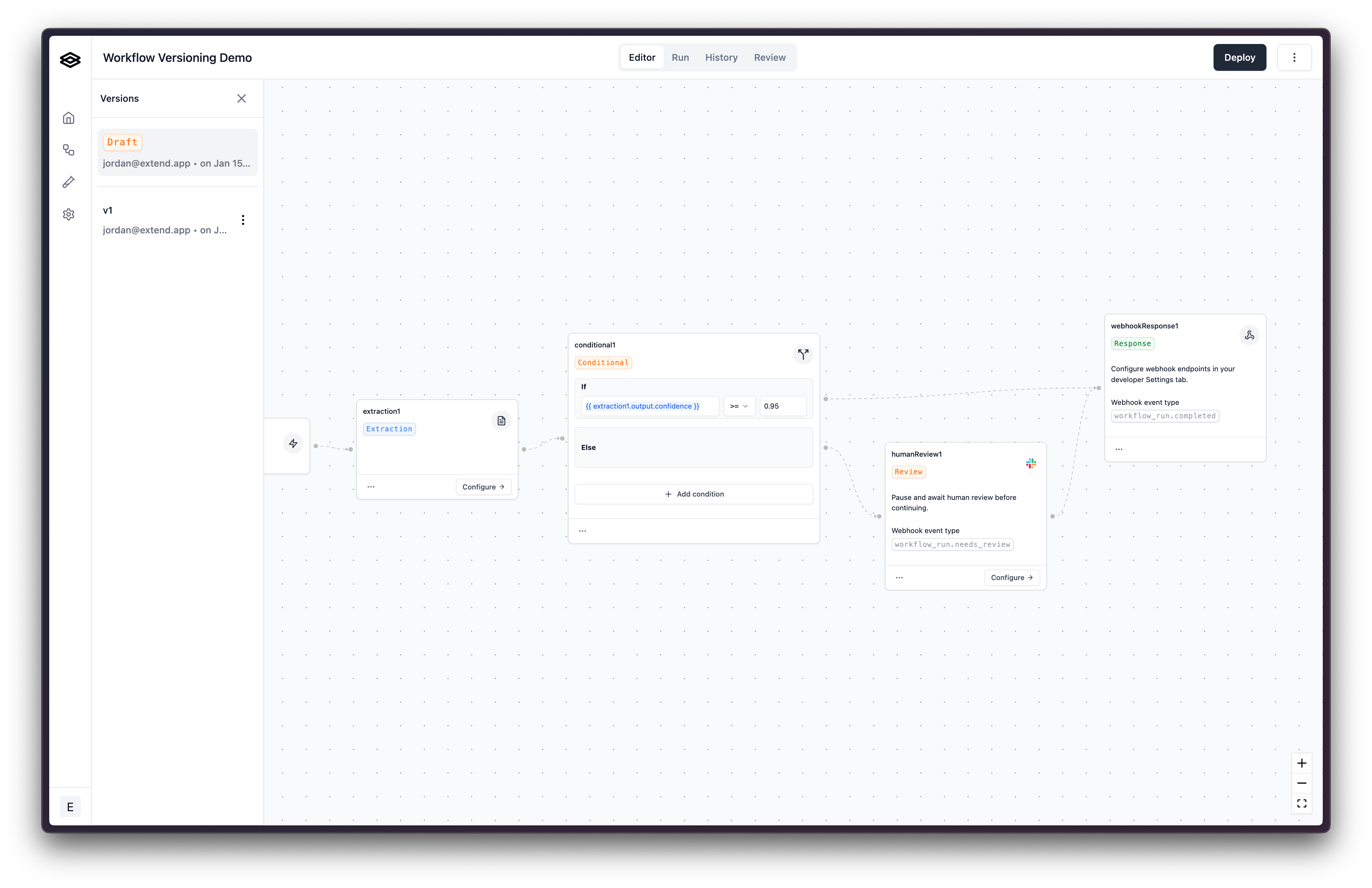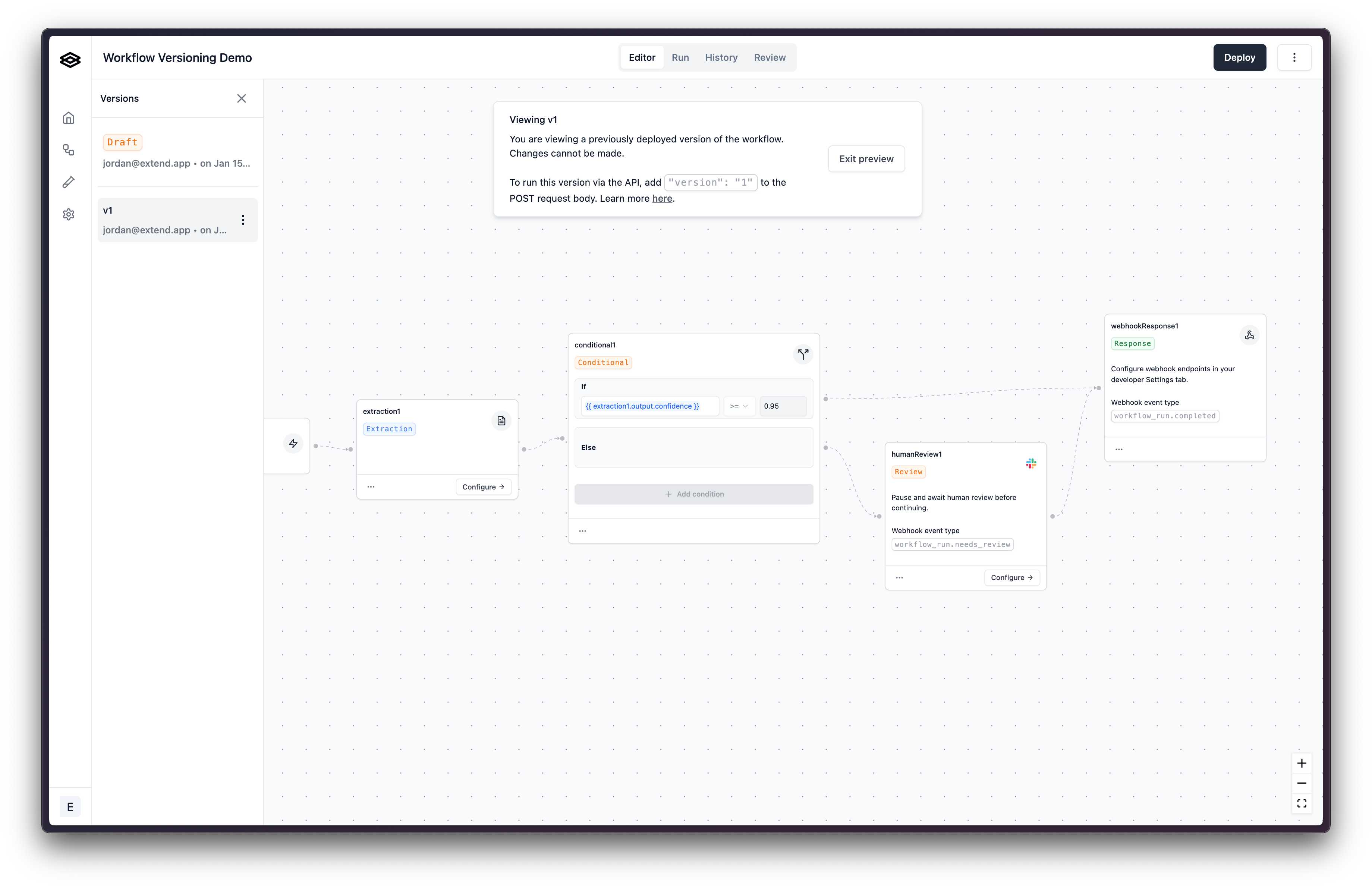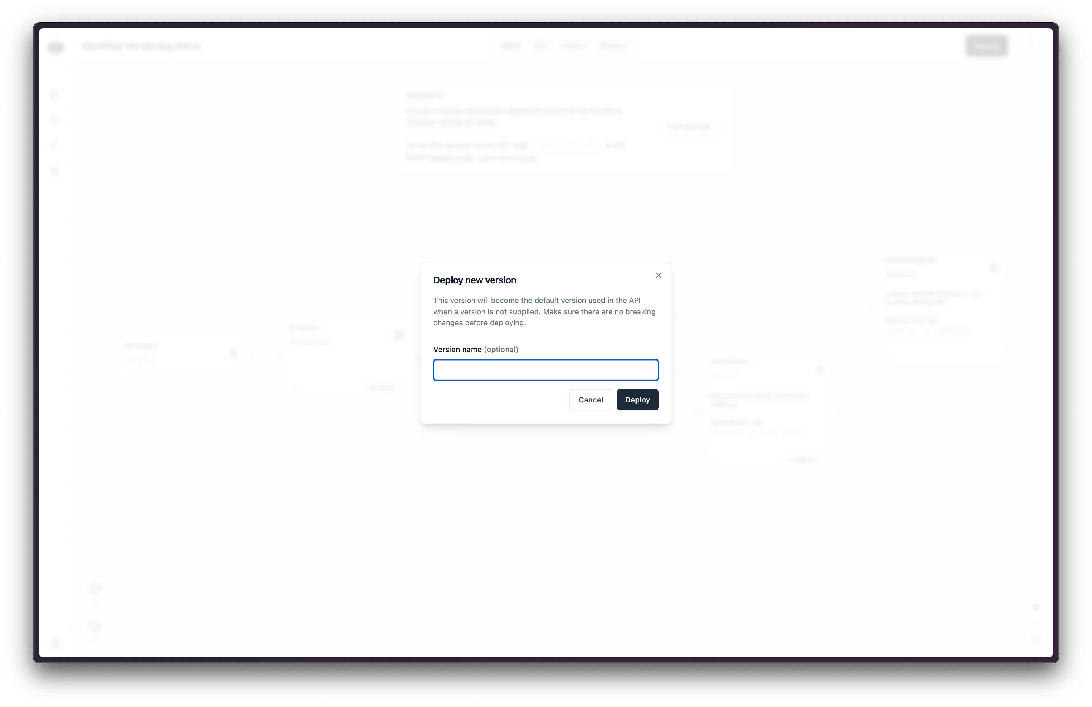 Workflow versioning allows you to deploy different versions of a workflow and run a specific version of the workflow. This is useful when you want to make changes to a workflow, but don’t want to affect the currently deployed versions of the workflow. For details on how to run the different versions of a workflow via API, see the API docs.