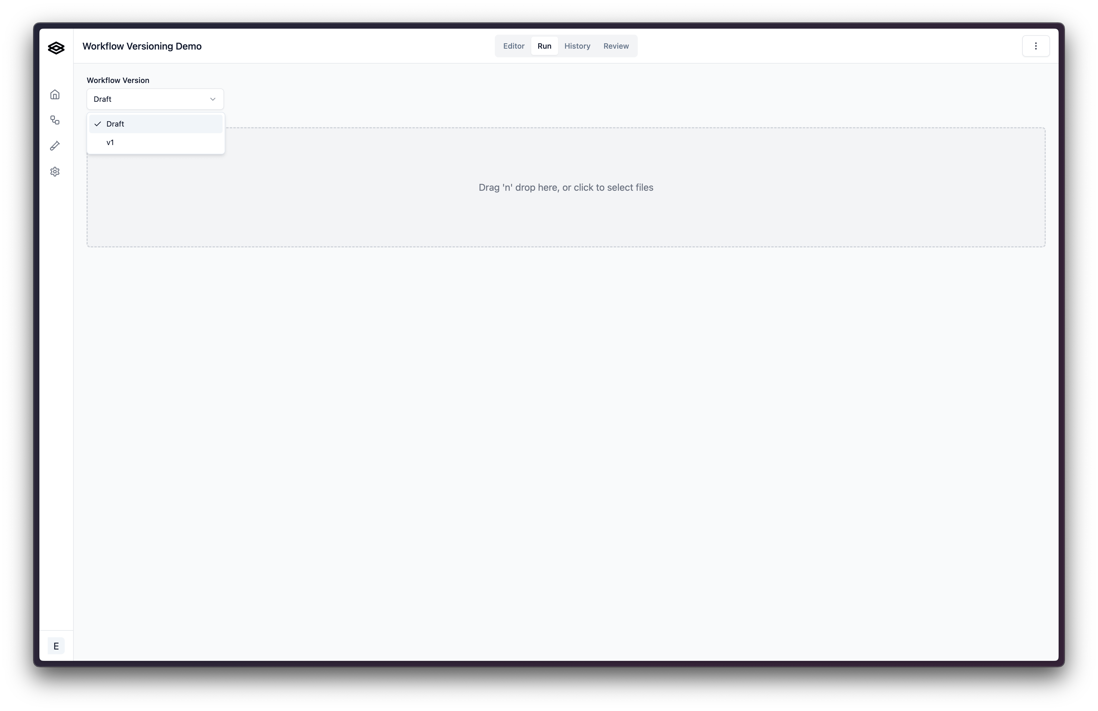 When running a workflow, you can choose which version of the workflow to run. By default, the “Draft” version of the workflow will be run, but you can choose a different version from the dropdown.