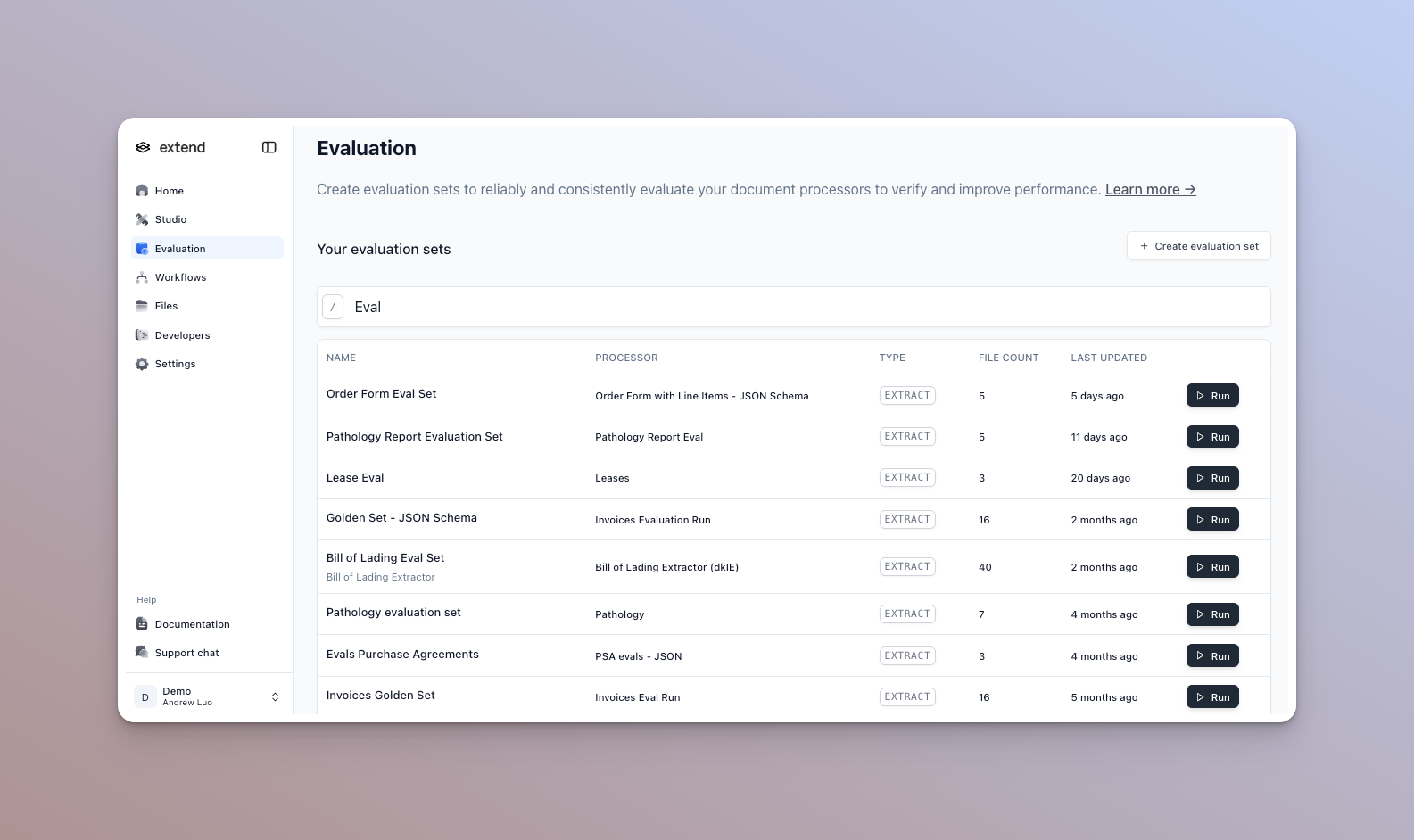 Evaluation plays a key role in building the best AI document processors for your use cases in Extend: