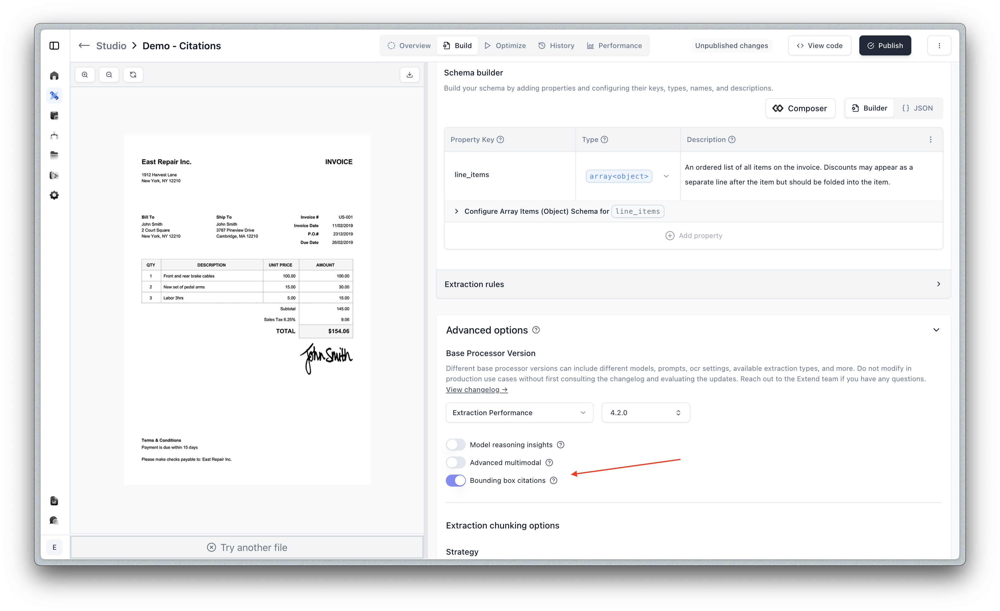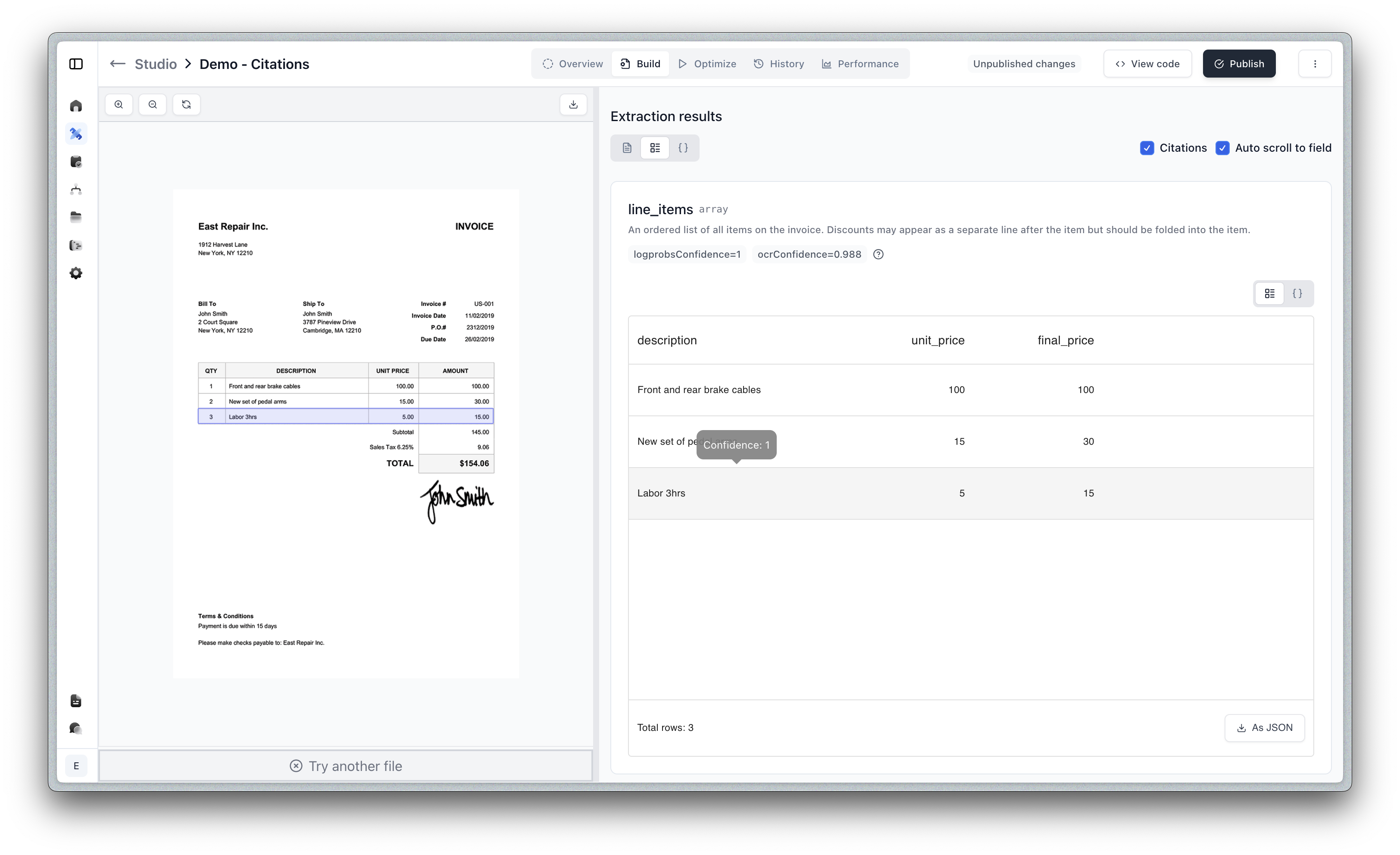 Citations are a way for you to get bounding box references and citation text for every field in your extraction.