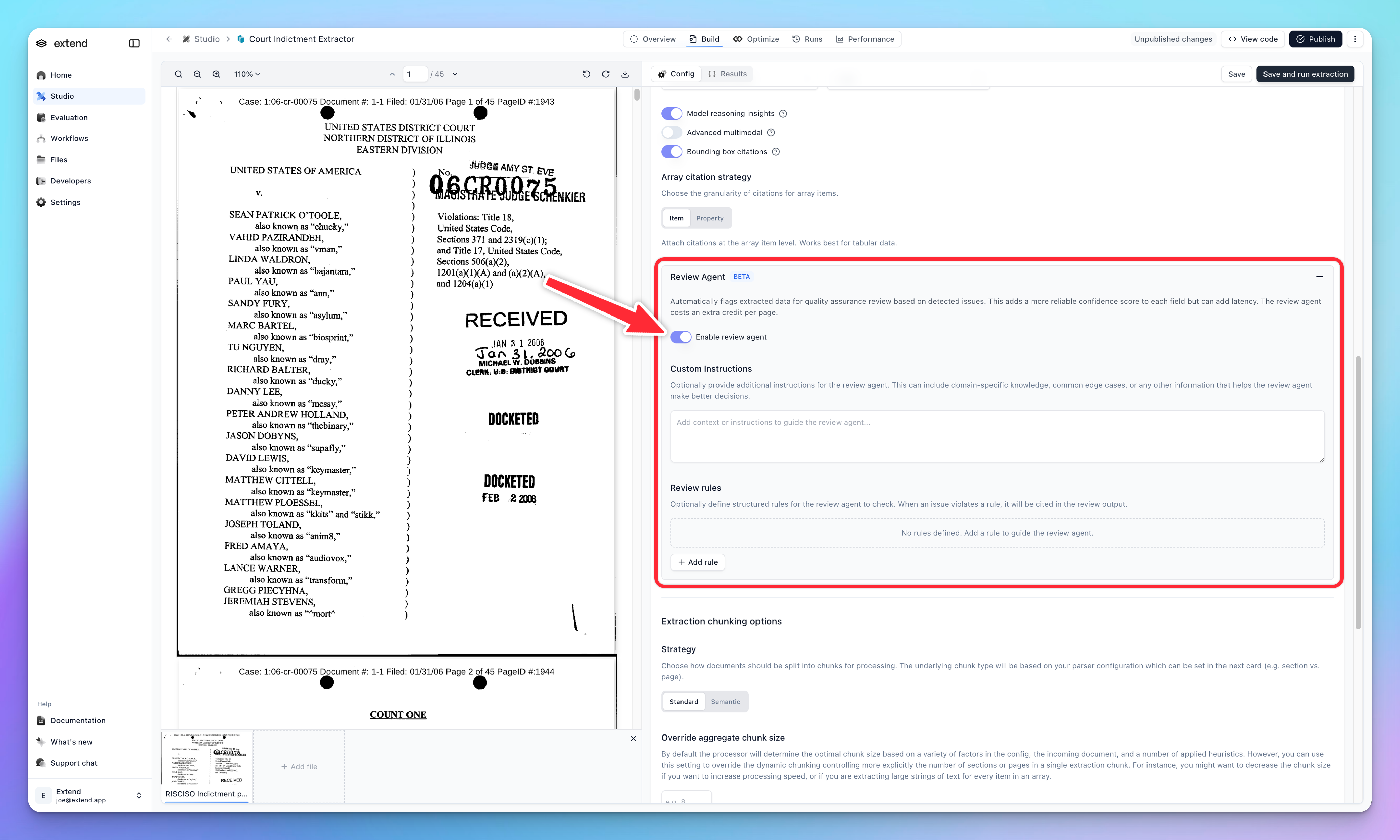You can activate the Review Agent in the Advanced settings for your extractor.