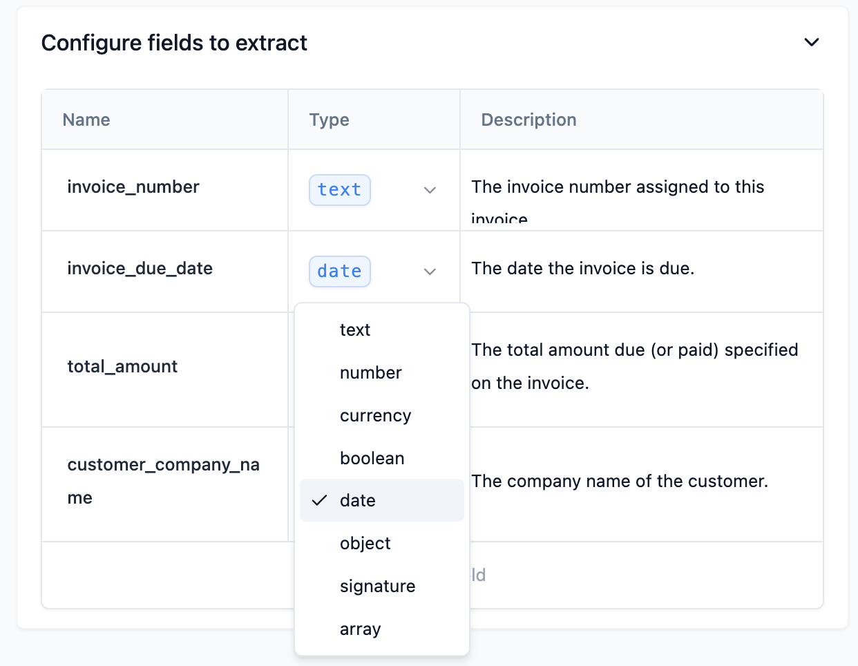 Use the signature data type when you want to extract a signature from a document. For example, if you want to extract the signature of a person from a document, you would use the signature data type. Signature fields will automatically extract all relevant details of a document’s signature block: