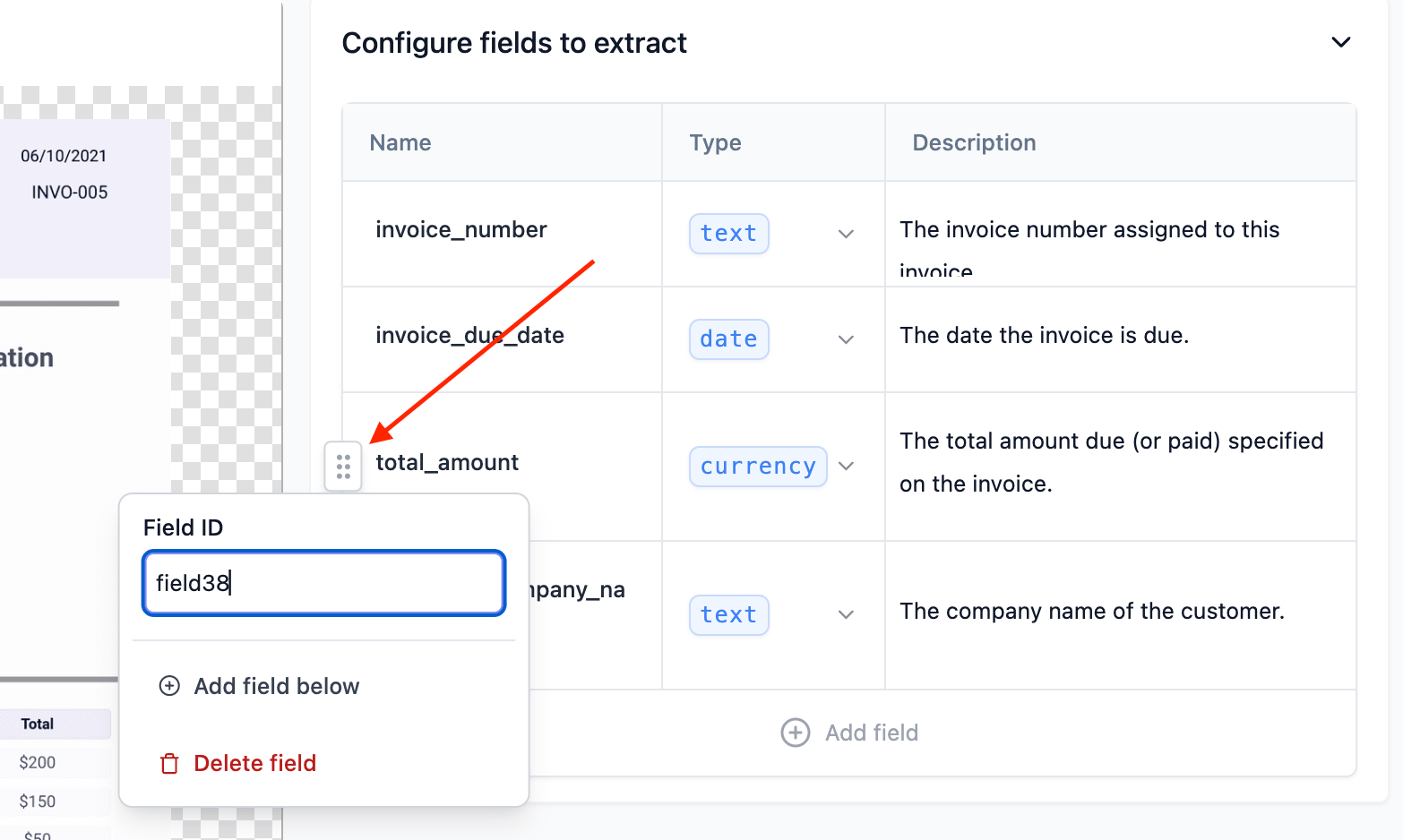 To configure a field in the legacy system, add a semantically accurate field name and write a description that explains how to identify and extract that field from the document.