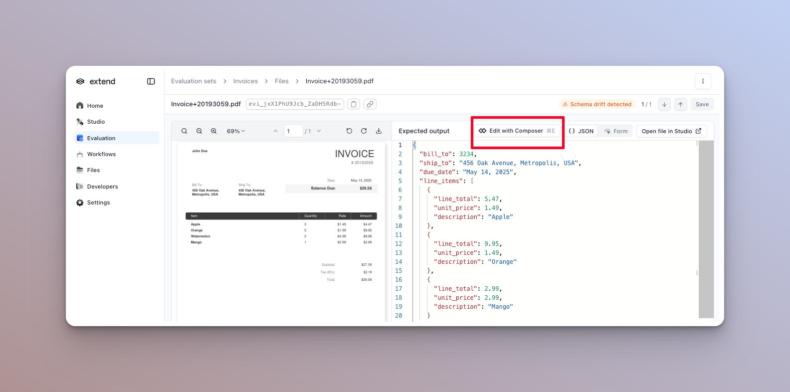Composer is available in extractor evaluation sets as an editor assistant. It can help with schema drift and bulk editing of expected outputs.