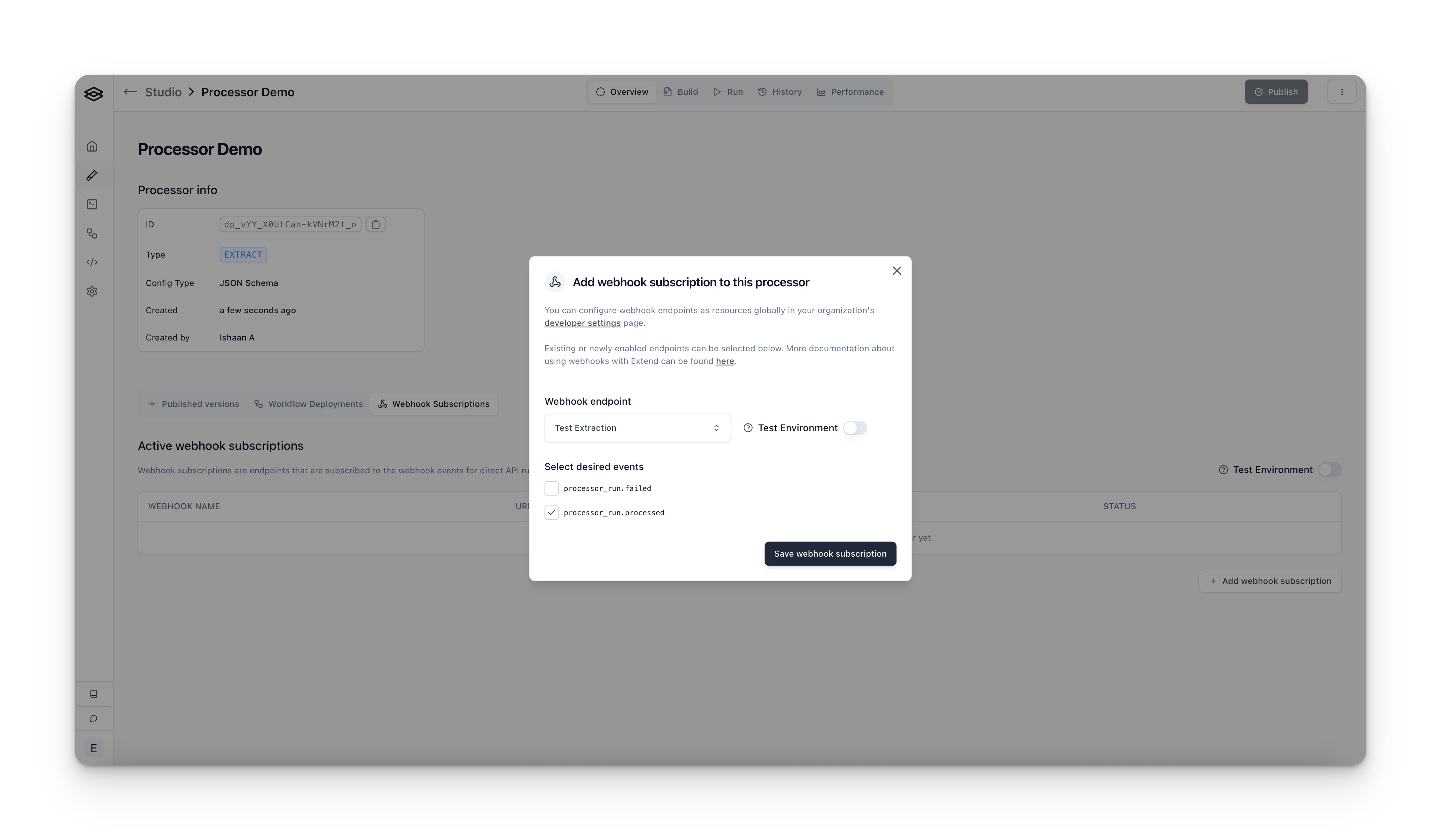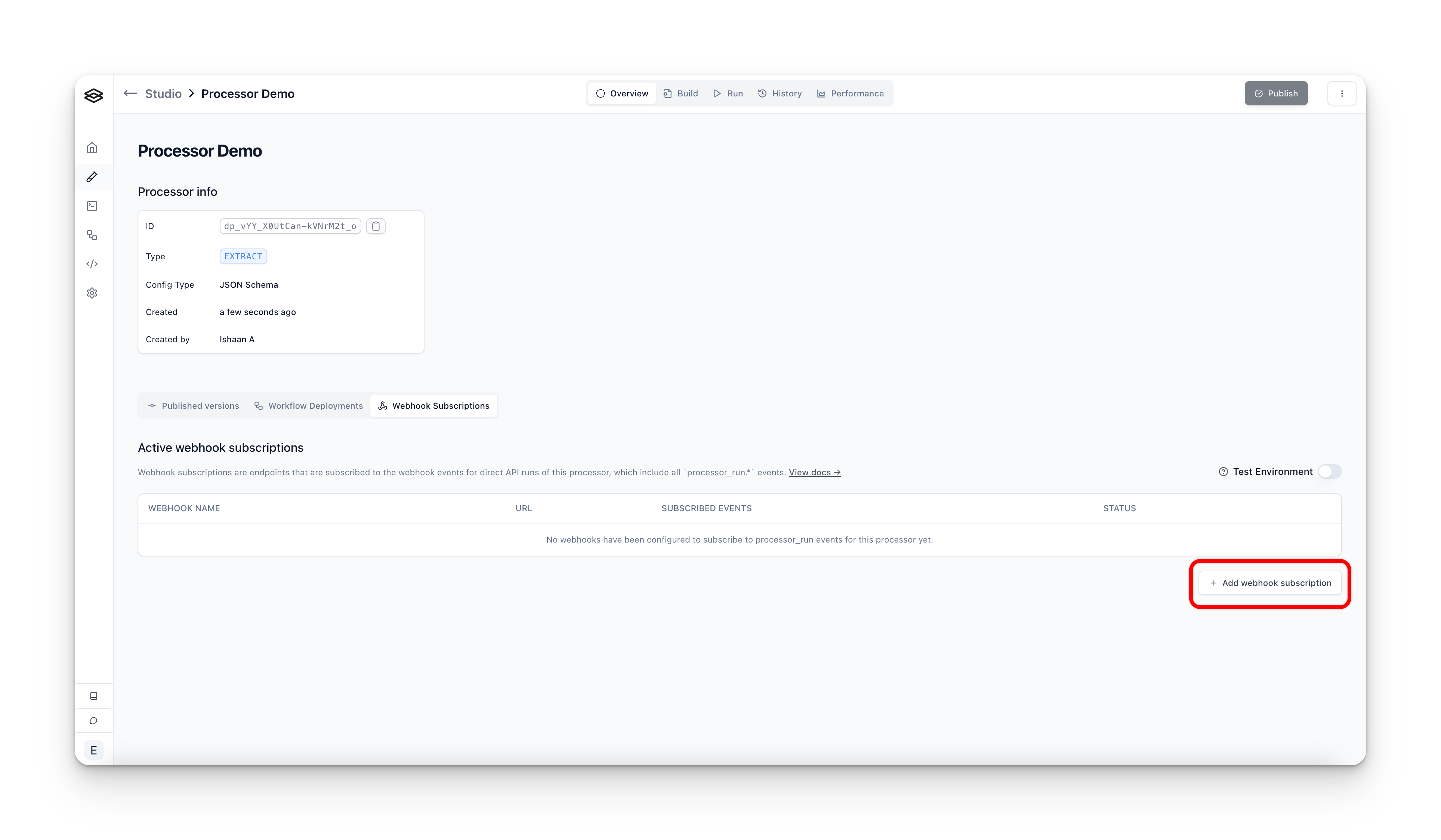 To start, navigate to the “Overview” tab of the given processor in Studio, click “Webhook Subscriptions”, and then click the “Add webhook subscription” button.