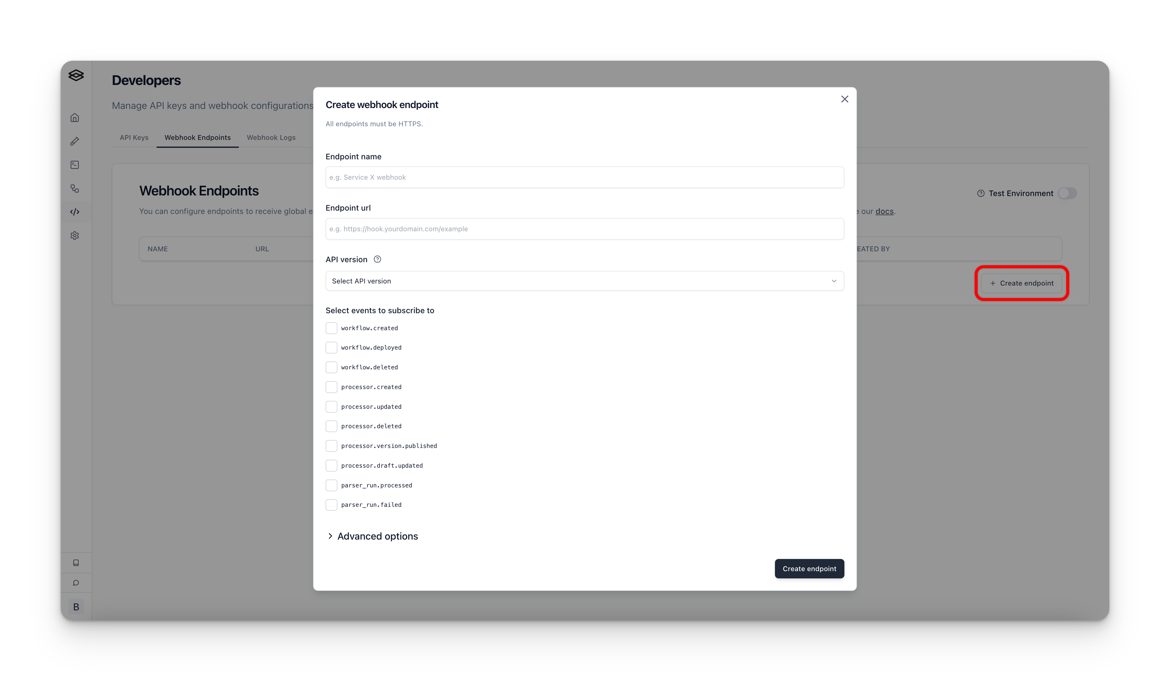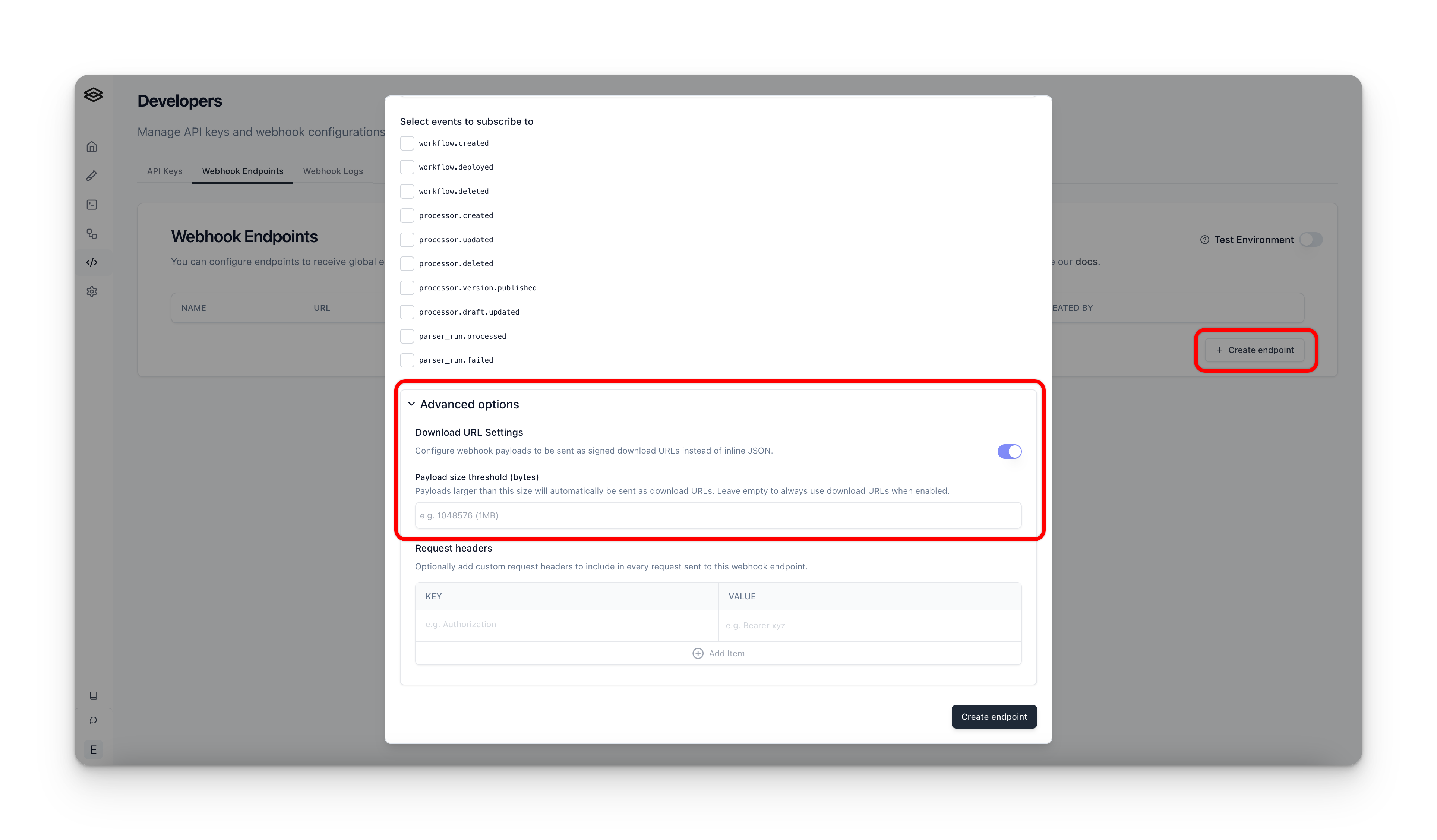 To configure the delivery format, you can select the desired format in the “Advanced options” dropdown when creating/updating a webhook endpoint.