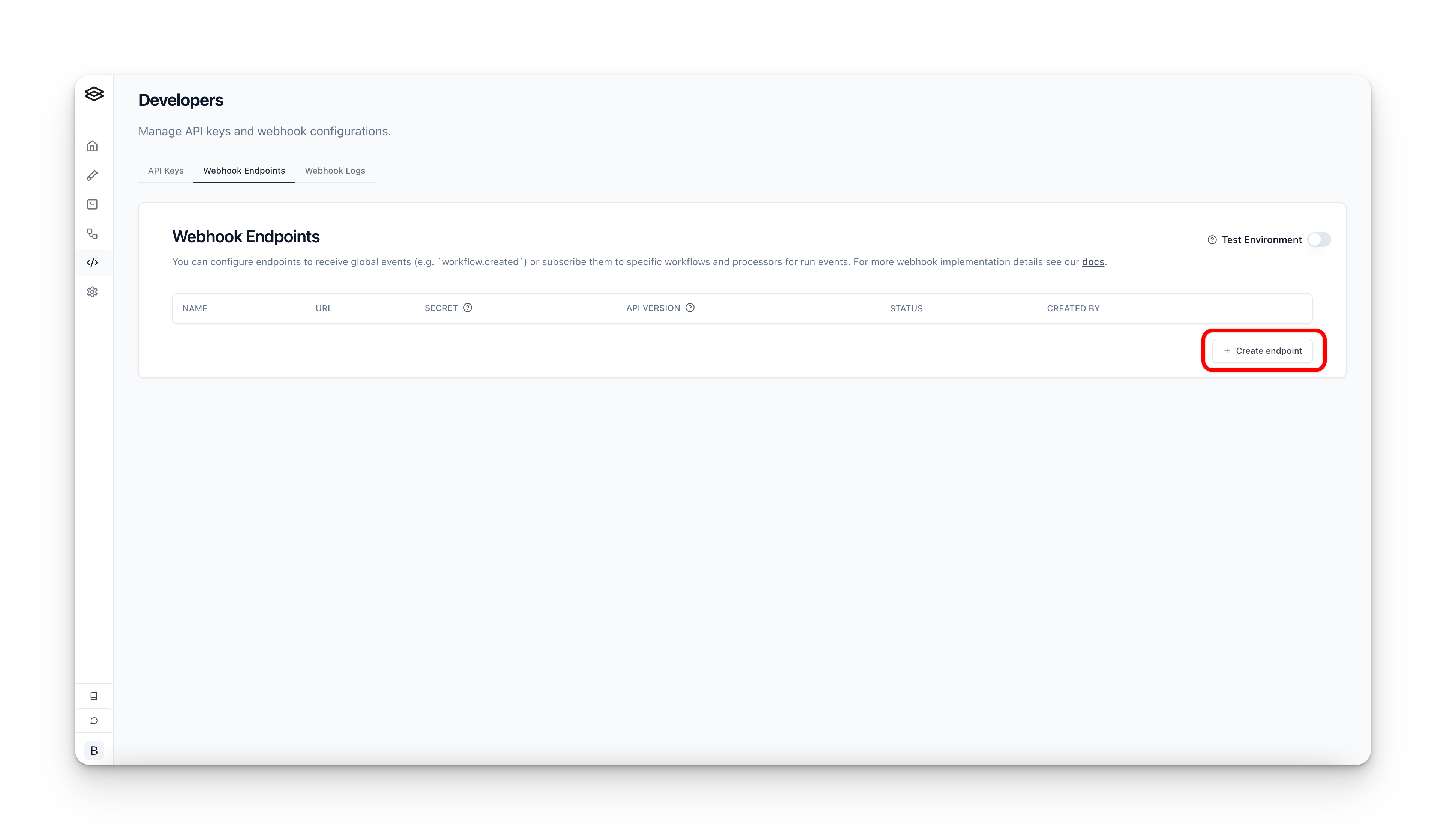 After you have created one or more webhook endpoints from the “Developer” tab, you can subscribe to events for specific workflows by navigating to the desired workflow(s) and opening the “Webhook Subscriptions” menu.