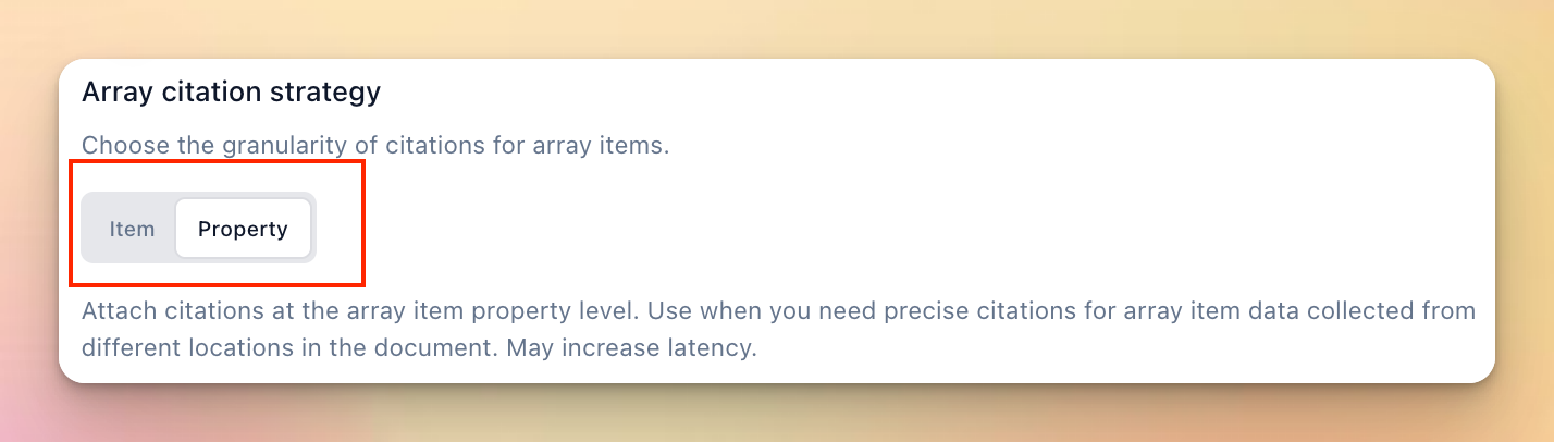 You can now configure the granularity of citations for extracted arrays, with the ability to choose between item or property level citations.