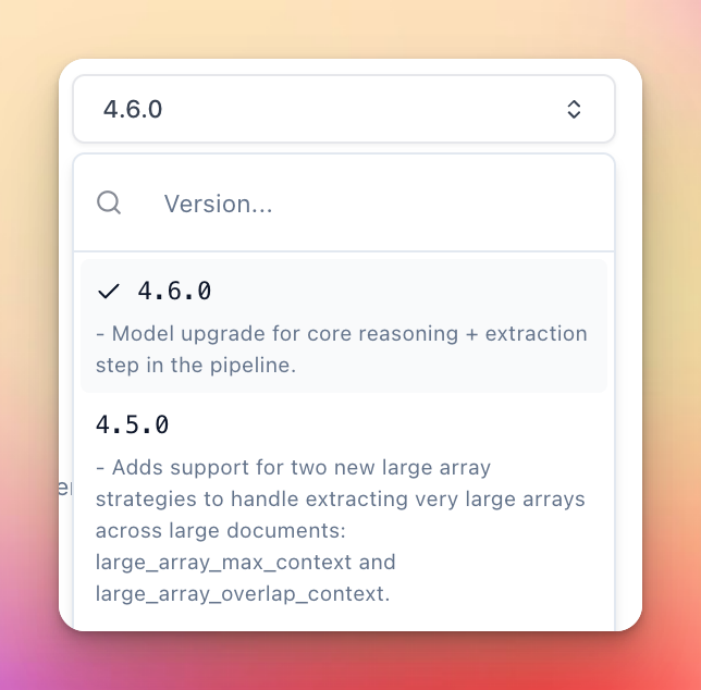 4.6.0- Rolls out a new foundation model that is a major performance improvement for all extraction tasks based on our internal benchmarks, especially for tasks that require more visual reasoning and generating long sequences of text.4.5.0- Adds support for two new large array strategies to more declaratively handle extracting very large arrays across very large documents:large_array_max_contextandlarge_array_overlap_context.