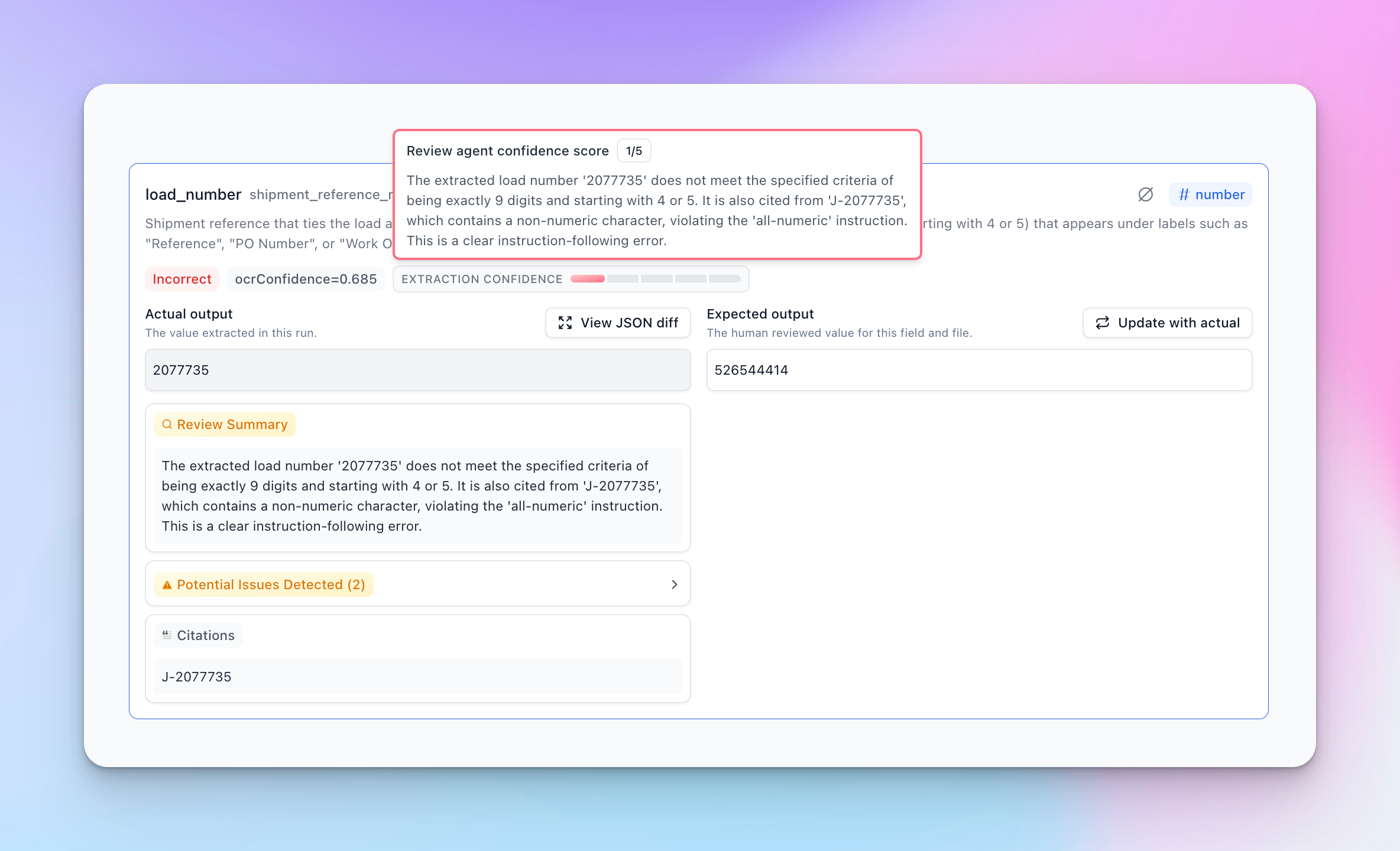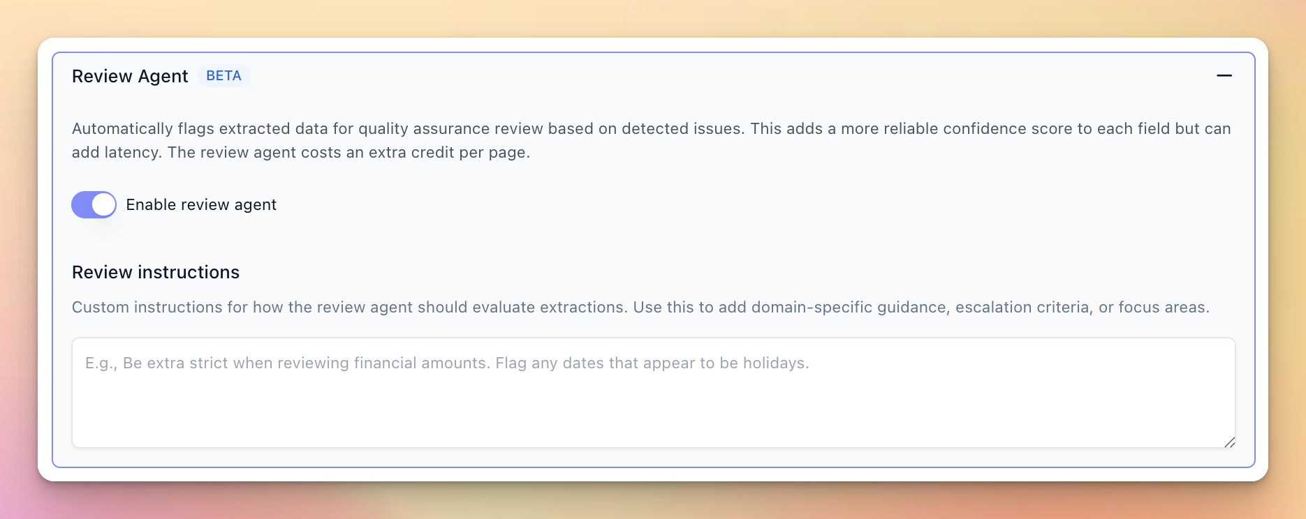 Review Agent automatically detects and scores issues in extraction by reviewing extractions with a critical lens. It flags potential problems such as rule following, ambiguous responses, incorrect extractions, and more, with a confidence score of 1-5.