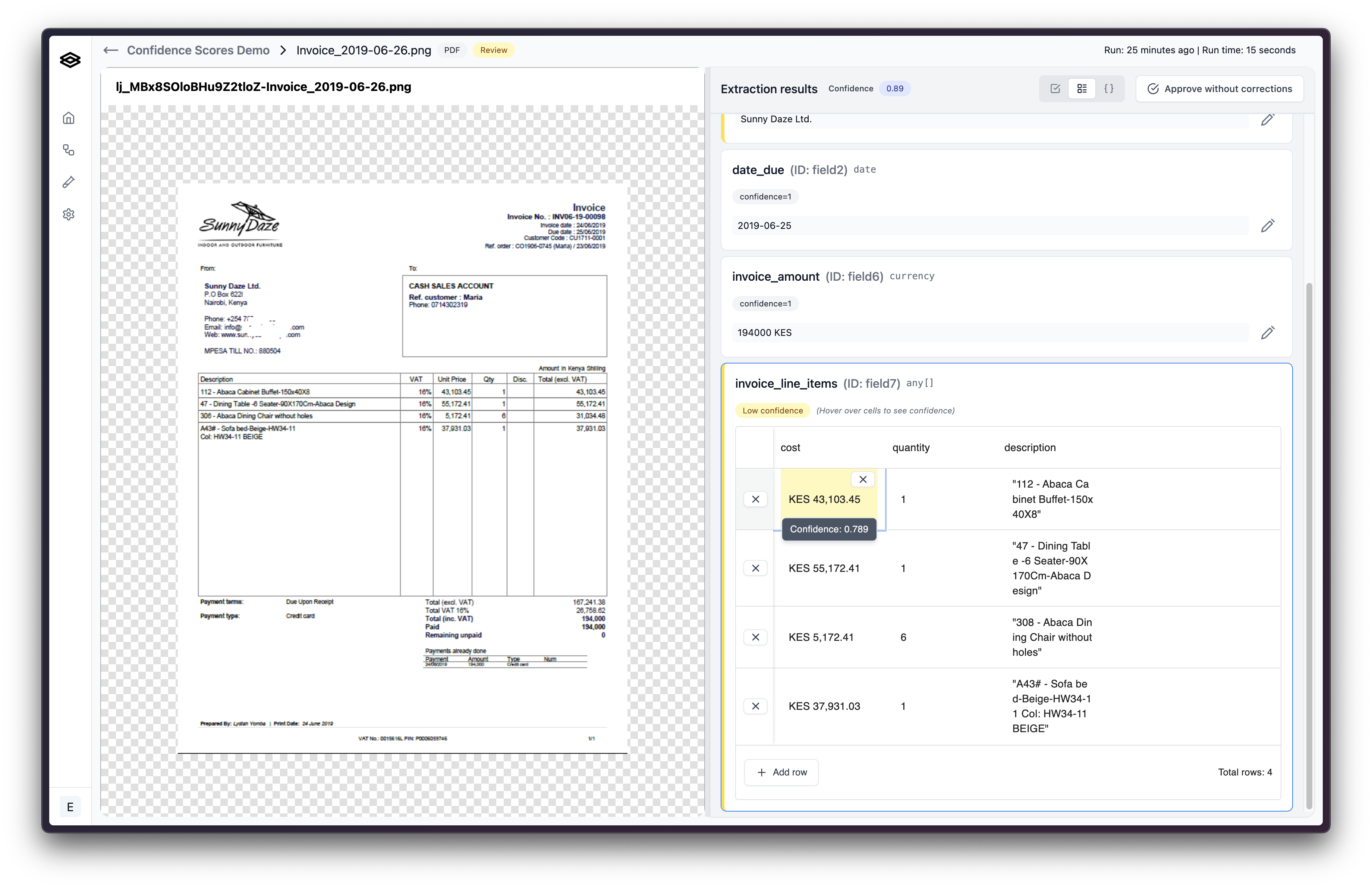 For Fields Array processors, confidence scores are included within the array field result structure. To view these confidences in the UI, hover over the cell the value is contained in.