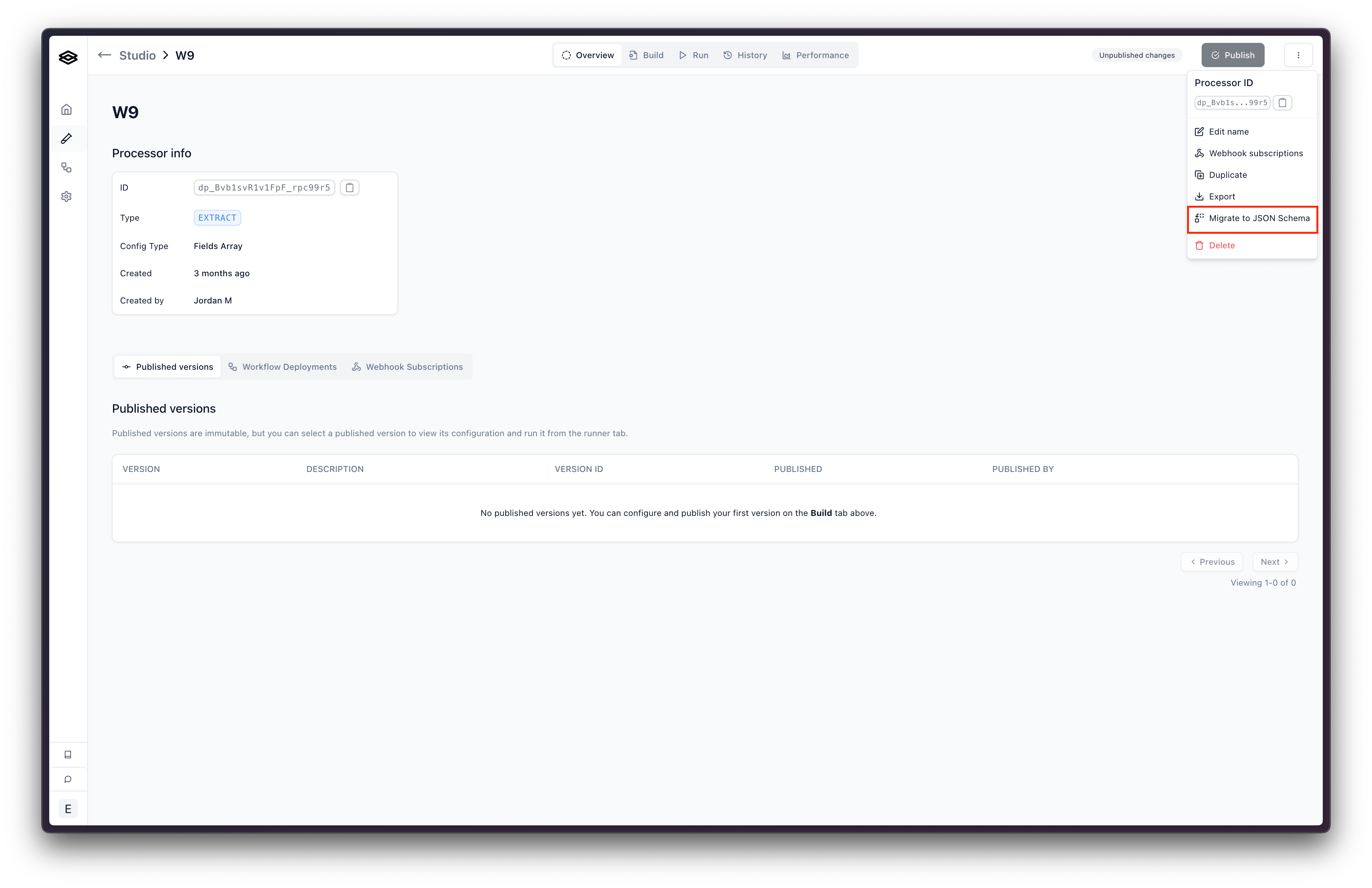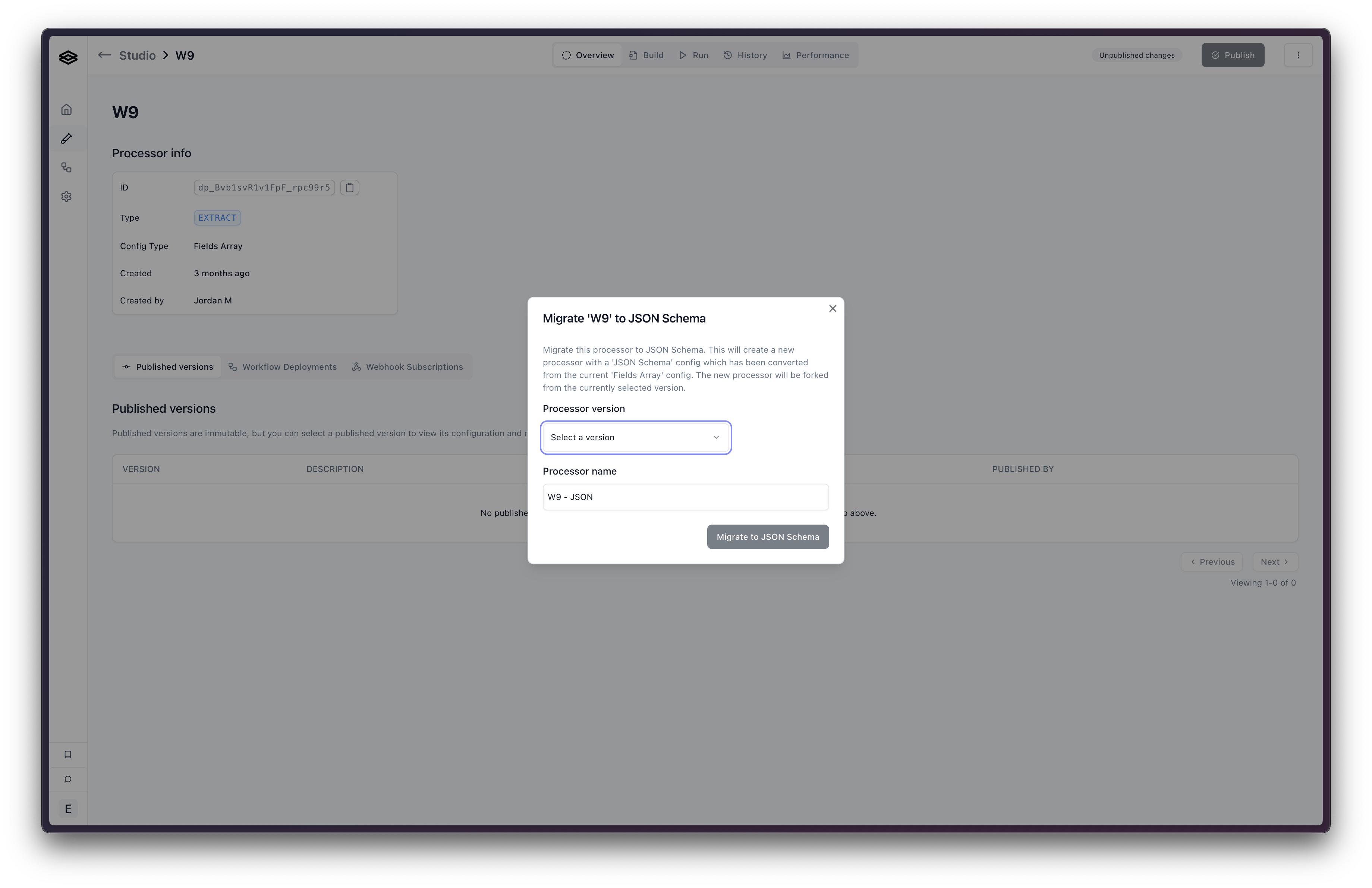 - Click “Migrate to JSON Schema”. This will open a modal where you can select the version and choose the name for the new processor. Click “Migrate to JSON Schema”. This will create a new processor with the fields array replaced with a JSON Schema config object.