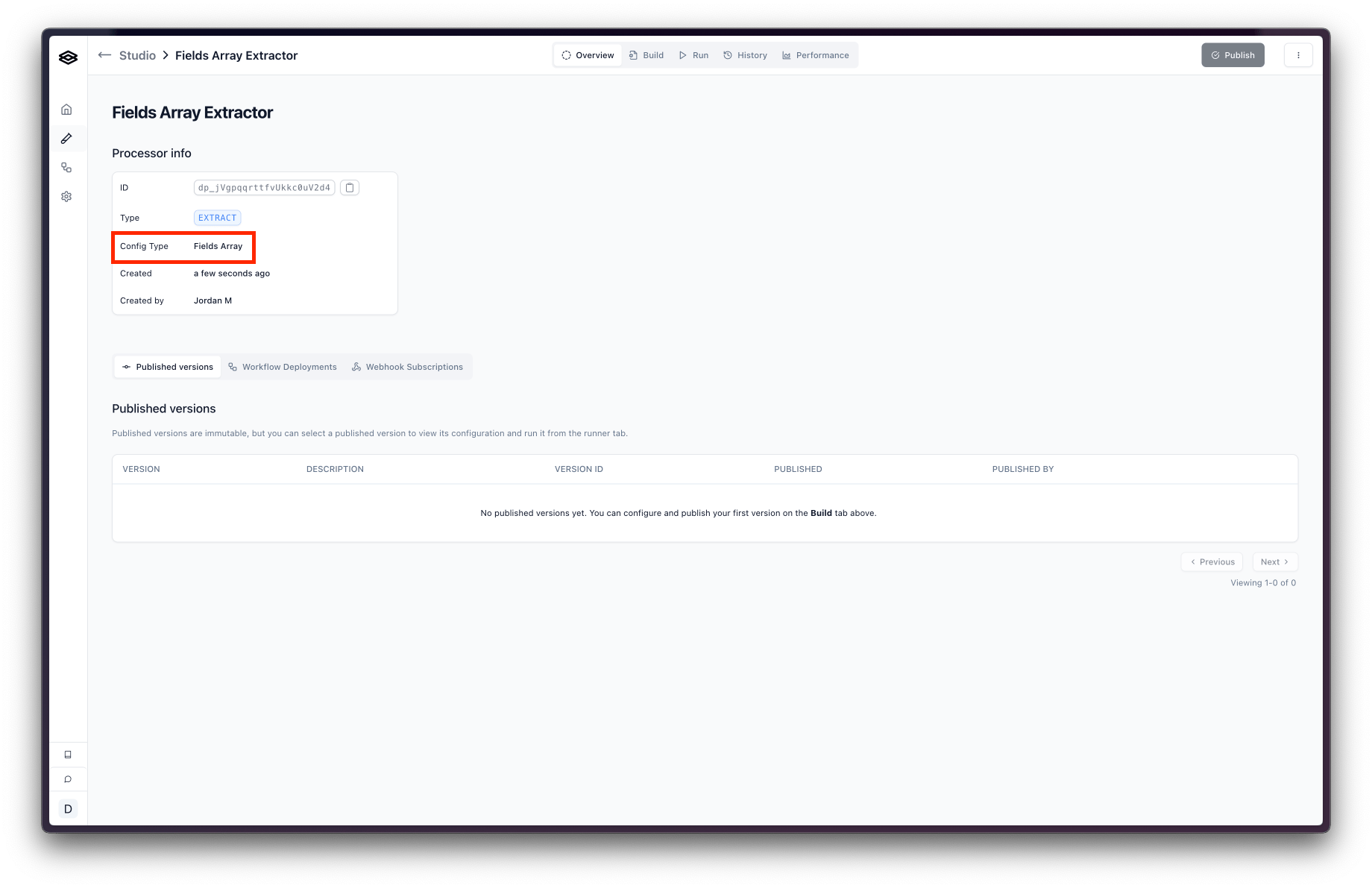 If your organization started using Extend before April 2025, you likely have been using the Fields Array config type. You can tell whether a processor is using the Fields Array config type by looking at processor details in the Studio. If you don’t see this section, your processor is using the JSON Schema config type and you do not have access to the legacy “Fields Array” config type.