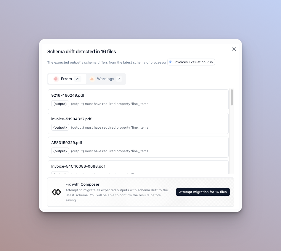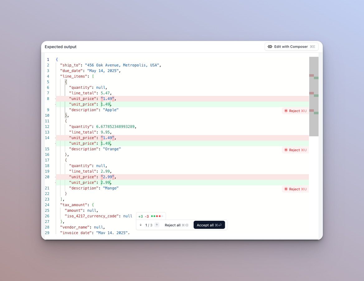 Composer is available in extractor evaluation sets as an editor assistant. It can help with schema drift and bulk editing of expected outputs.