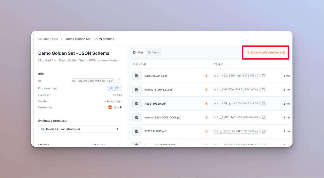 Schema drift occurs when the latest version of a JSON schema extractor’s schema does not match the expected output in the eval set. A warning will appear in the files page of the evaluation set home page if schema drift is detected.