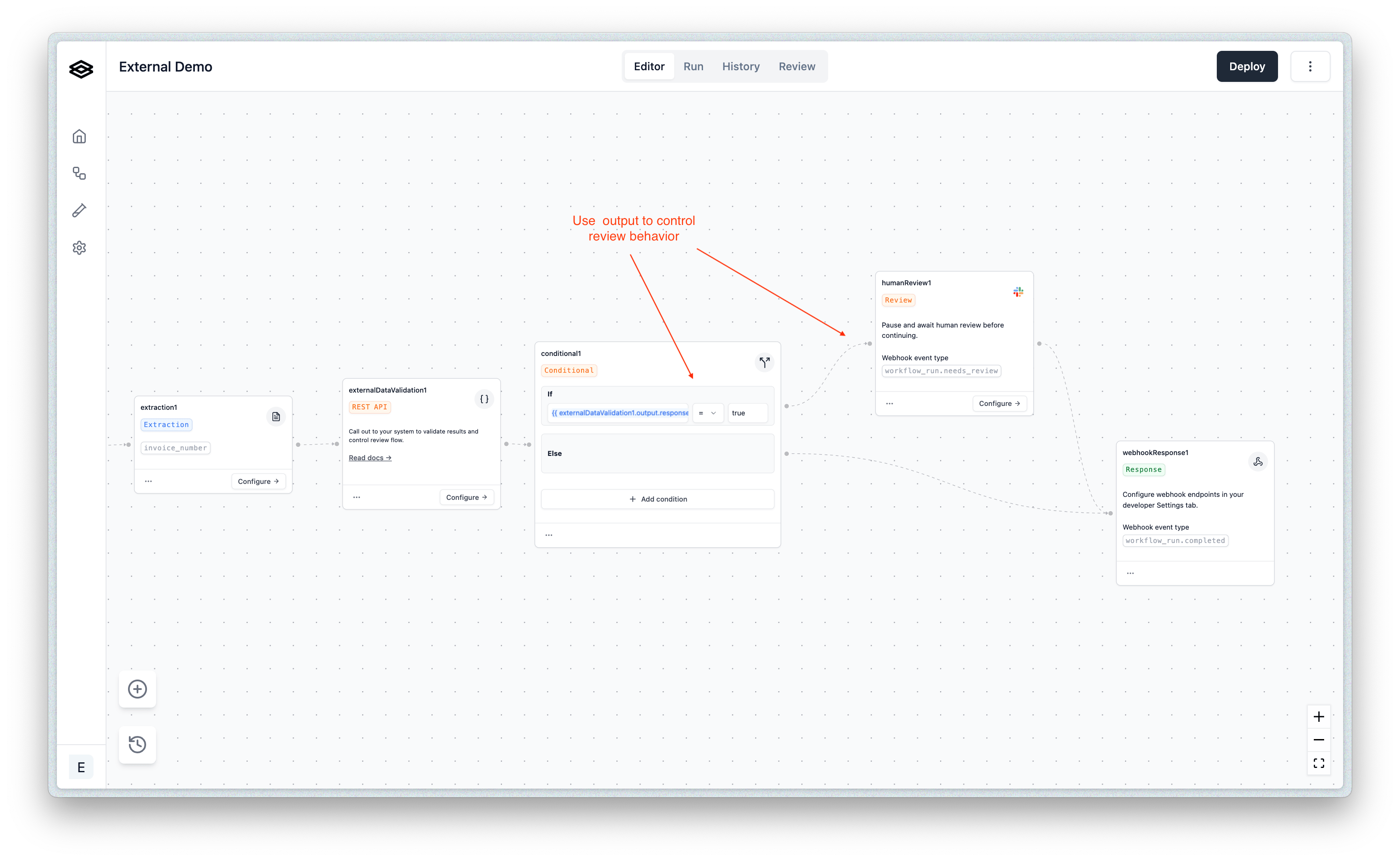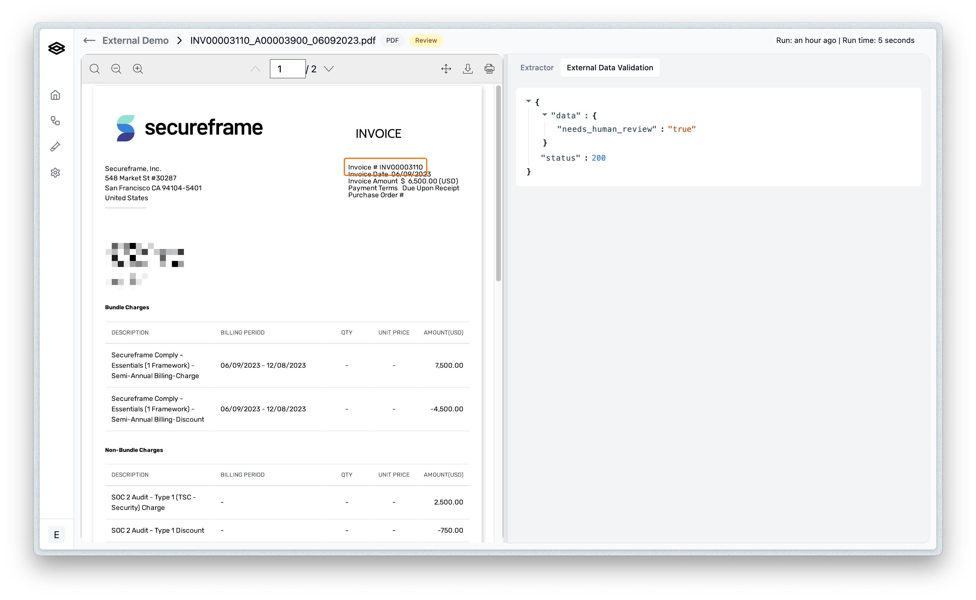 After a workflow run is completed, and if it was flagged for review (or not), humans can see the output of the external data validation step in the Review UI alongside extraction and other outputs: