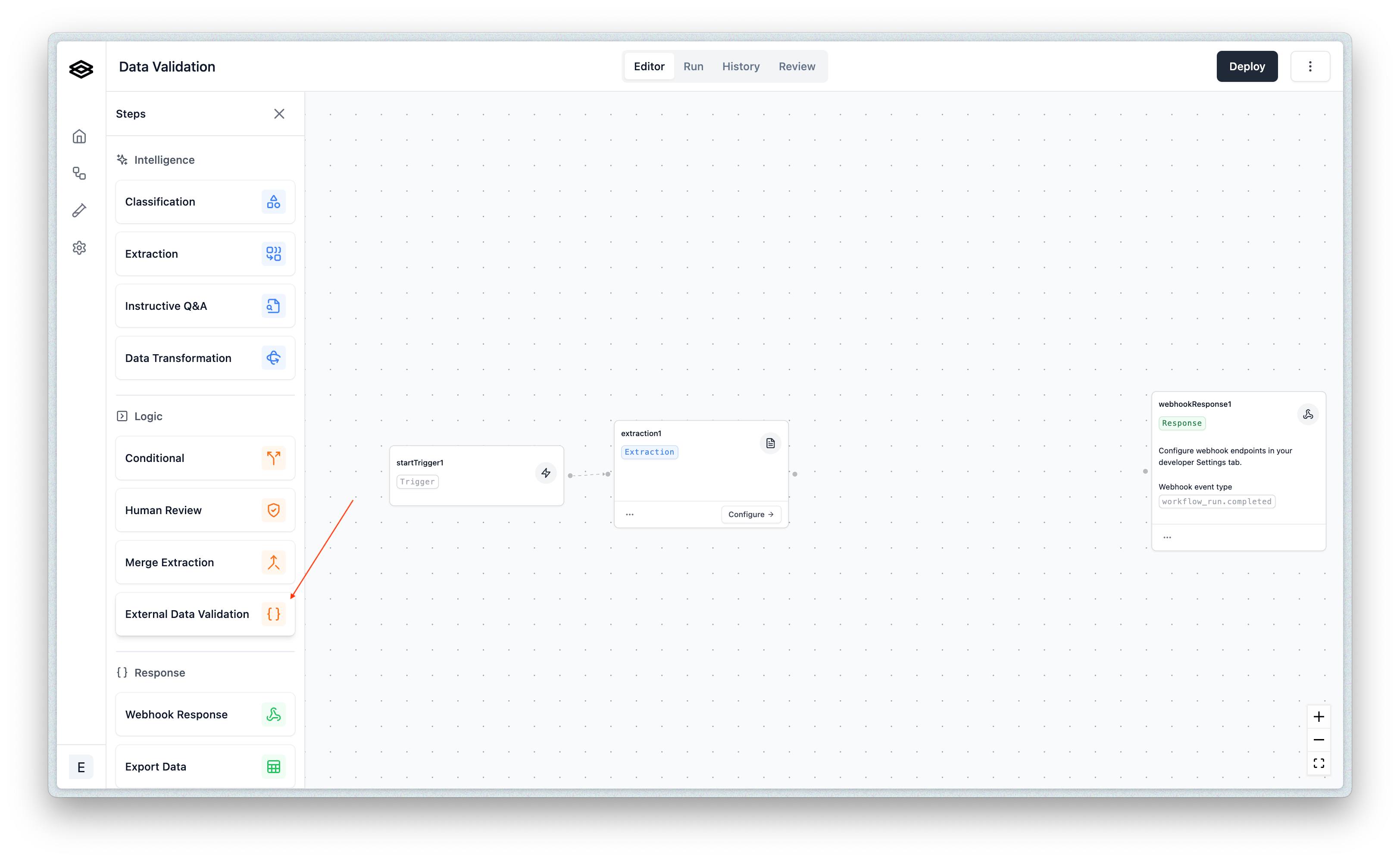 The External Data Validation step is a powerful tool that allows you to validate data within a workflow against your own system, provided that your system exposes an API for Extend to interact with.