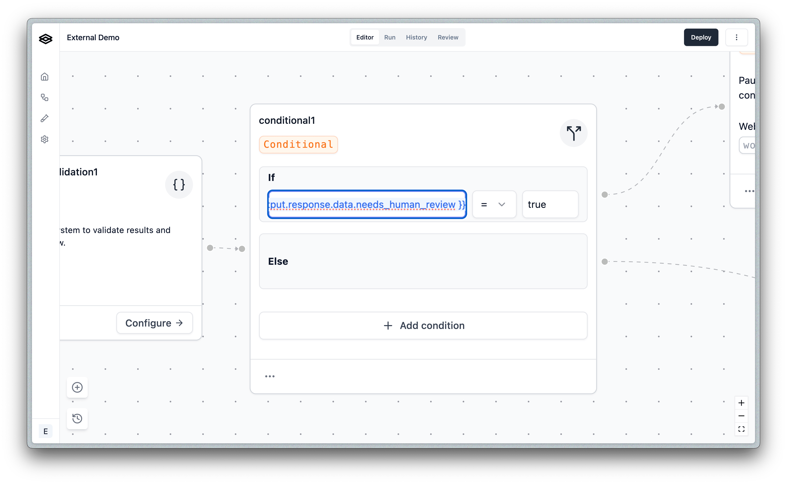 - Confidence Validation: Instead of relying purely on our AI based confidence scoring, you can match document data against your own system to determine if the data is realistic or not, and return a flag(s) accordingly. The flag(s) returned can then be used within a Conditional step to control workflow logic, for instance to route documents with low confidence to a human for review.